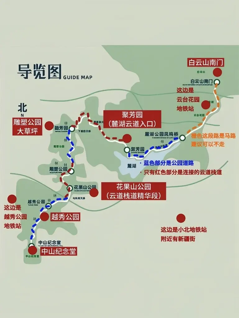 方向路径: 北往南(云台花园地铁站往南到越秀公园)或南往北(越秀公园到云台花园)