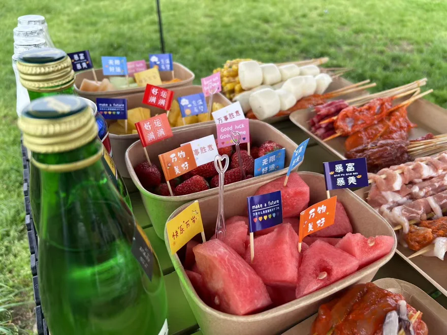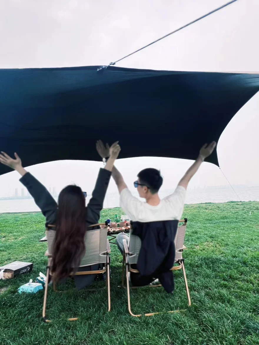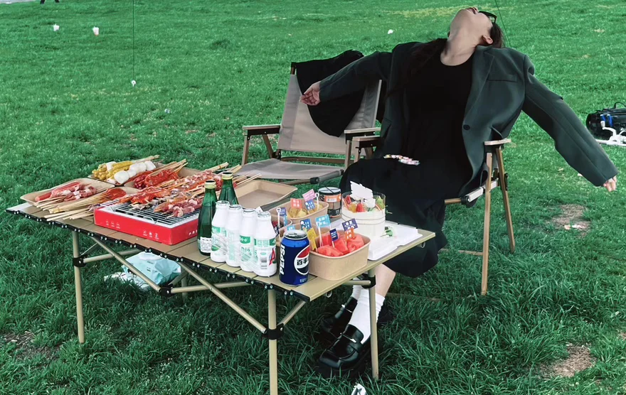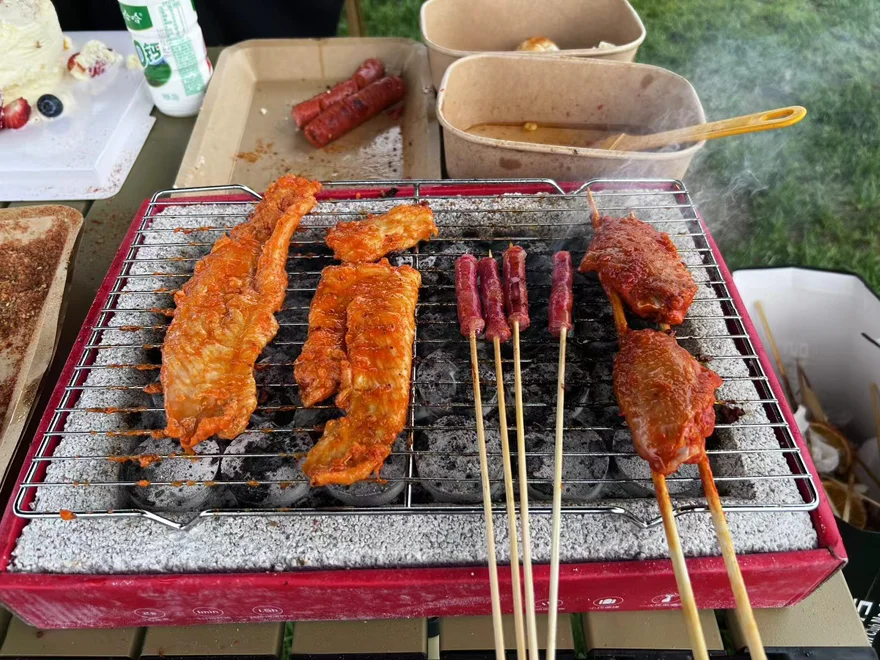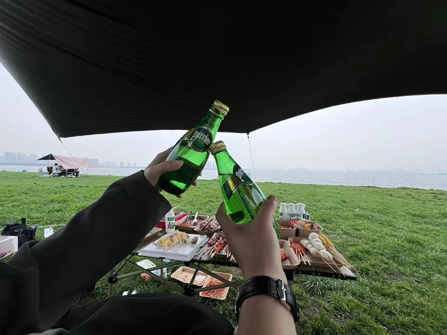 我们没去人挤的网红点,直接导航西山堂里古村静山夕阳观景处,路边就能免费停车,临湖一片开阔草坪,正是我们想要的清净地。支起天幕,摆好桌椅,把腌好的肉串、蔬菜、饮料一一摆开。炭火一旺,滋滋声就响起来,肉香混着春风飘远。我们边烤边聊,说工作里的琐事,讲最近的趣事,偶尔抬头看太湖波光粼粼,远处渔船慢悠悠划过,时间都慢下来。