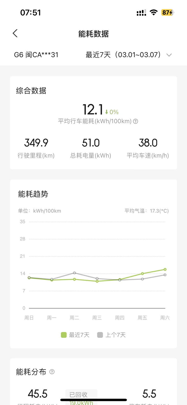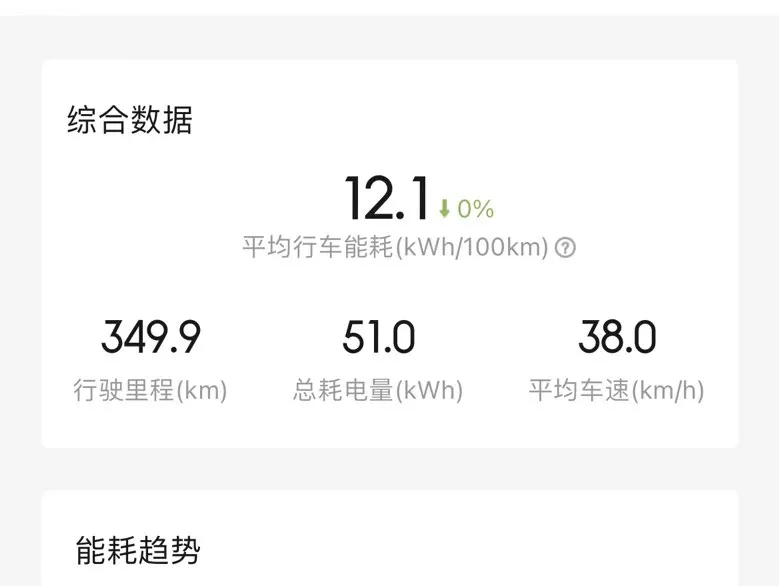 #能耗报告# 3.01-3.07行驶349.9km,总耗电51kWh,平均行车能耗12.1kWh/100km,平均车速38km/h,平均气温17.3℃。