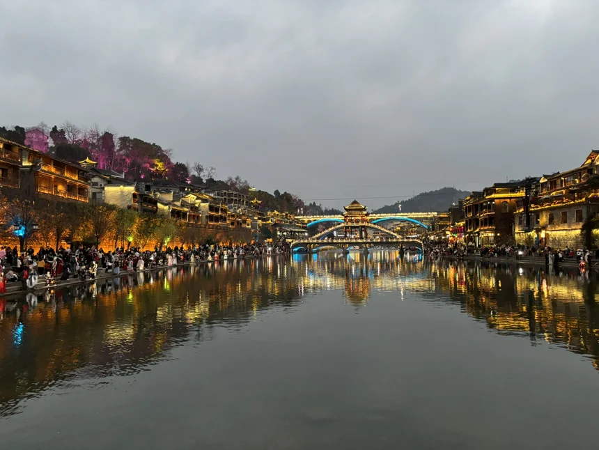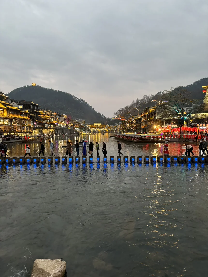 春天的凤凰,褪去了冬日的清冷,多了几分温柔的生机。沱江的水绿得像一块翡翠,两岸的吊脚楼在薄雾中若隐若现,青石板路上,偶尔有穿着苗服的姑娘走过,银饰叮当作响,和江水的潺潺声交织在一起,成了春天最动听的序曲。