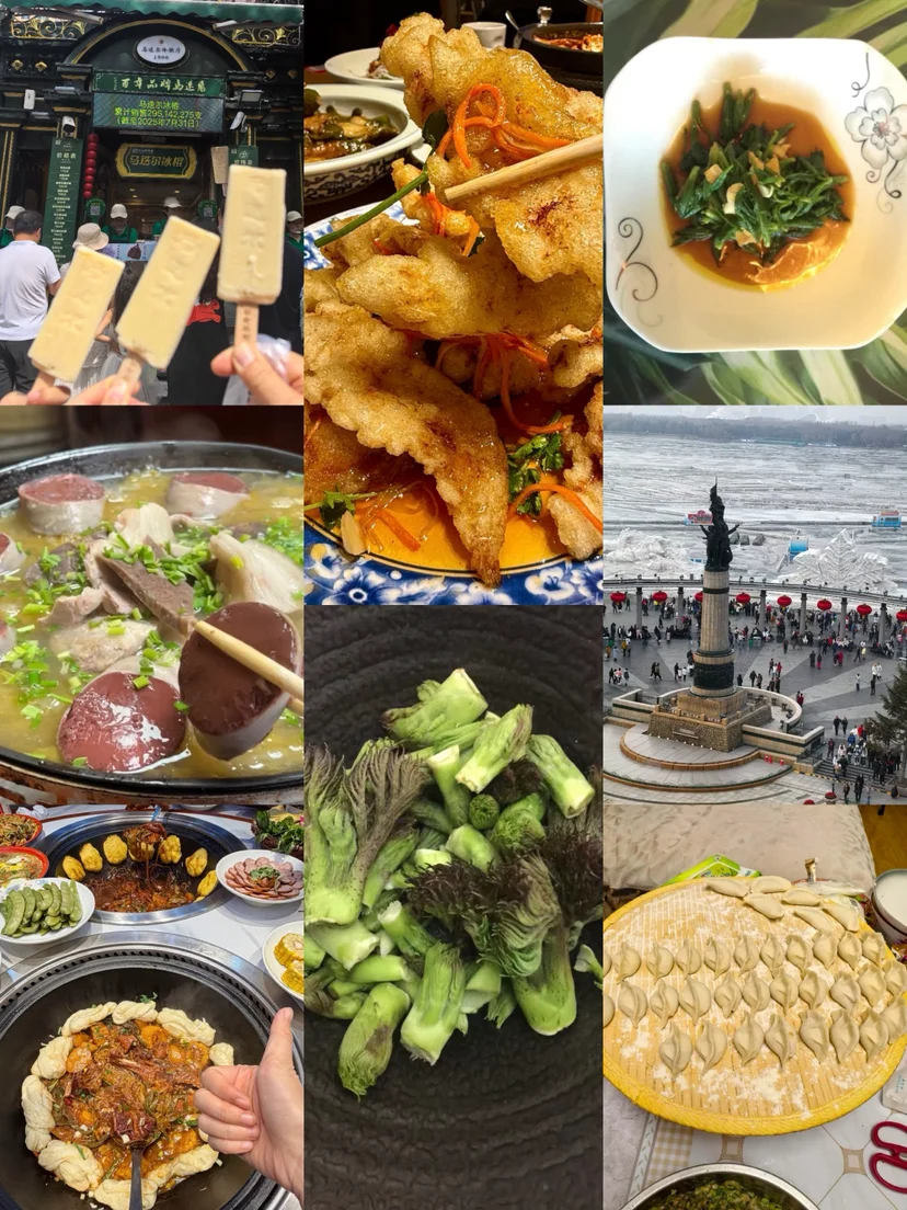 中央大街的马迭尔冰棍、秋林格瓦斯、华梅西餐厅的大列巴、老昌春饼,以及地道的锅包肉、铁锅炖、杀猪菜、得莫利炖鱼都是必尝之选