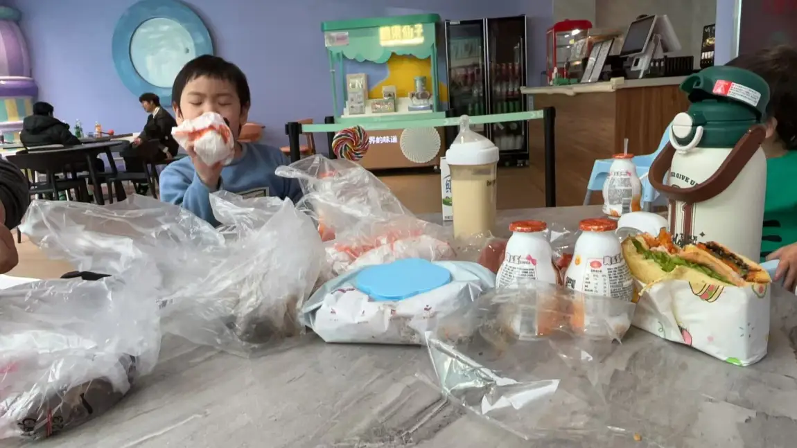 中午到了日照开元森泊酒店。我们去"幻想岛"儿童乐园疯跑了一阵,又在水族缸前看鱼看得入神。自己带的餐食很好吃,孩子端着饭碗站在玻璃前不肯走,有条河豚圆溜溜的,逗得他直笑。