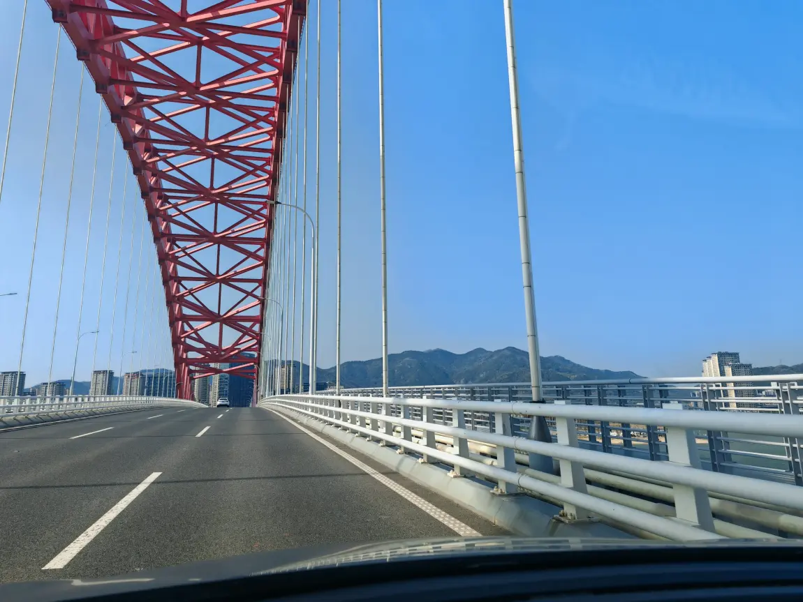 远远看见那座红色的拱架桥时,心跳都漏了半拍——它像一道长虹卧在海面,红色的钢构在蓝天里格外醒目。