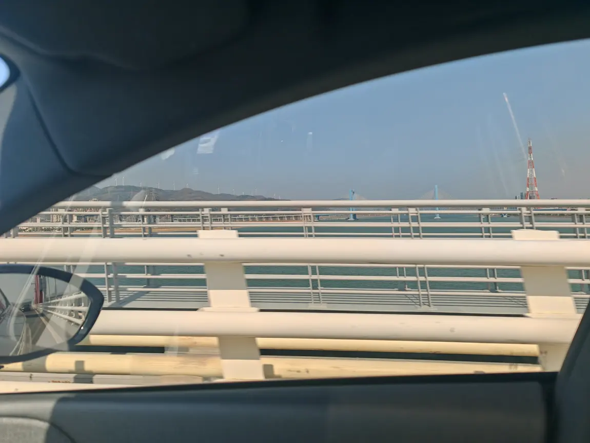 驶上桥面,透过车窗能看见桥下的海水泛着粼粼波光,远处的风车和另一座斜拉桥勾勒出工业与自然的交融。