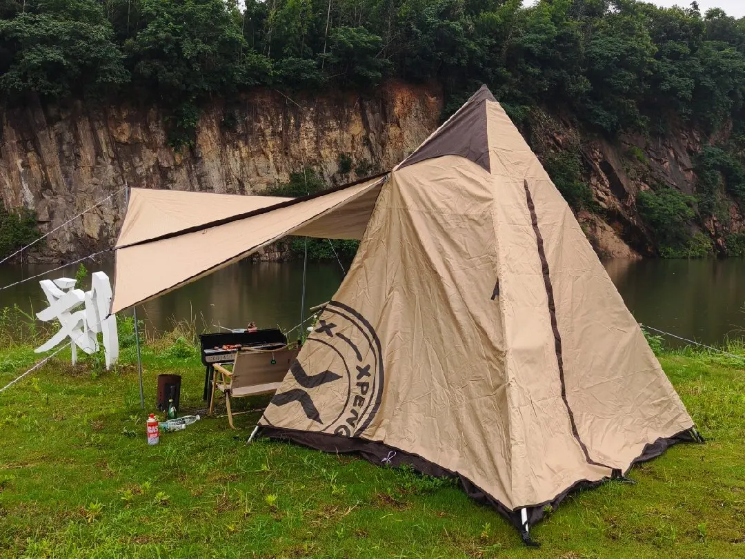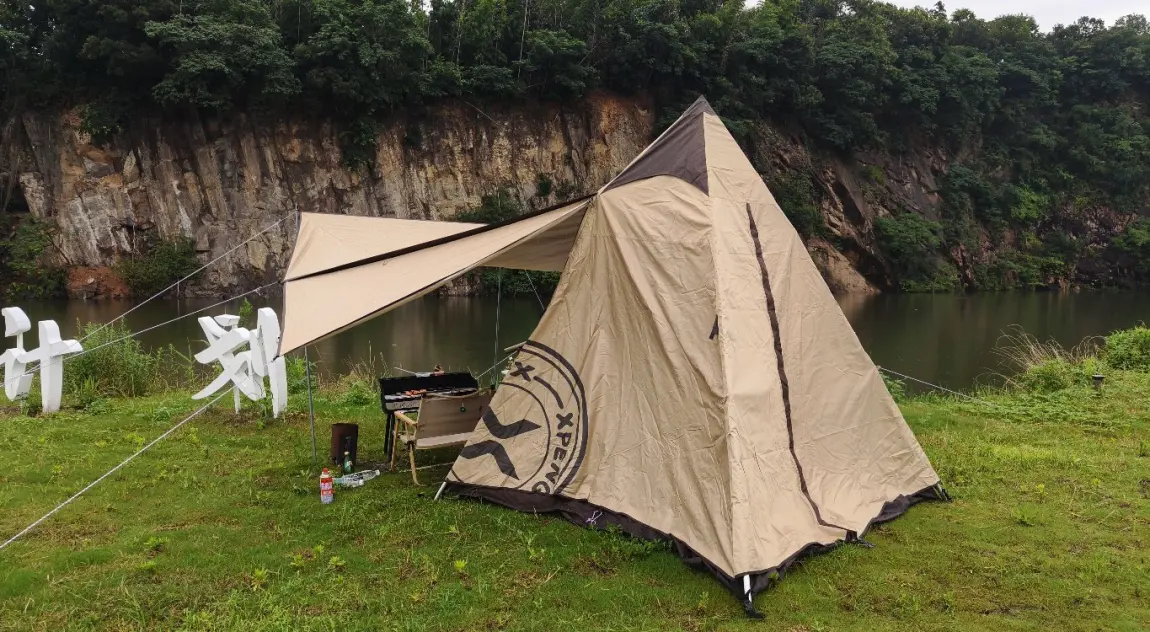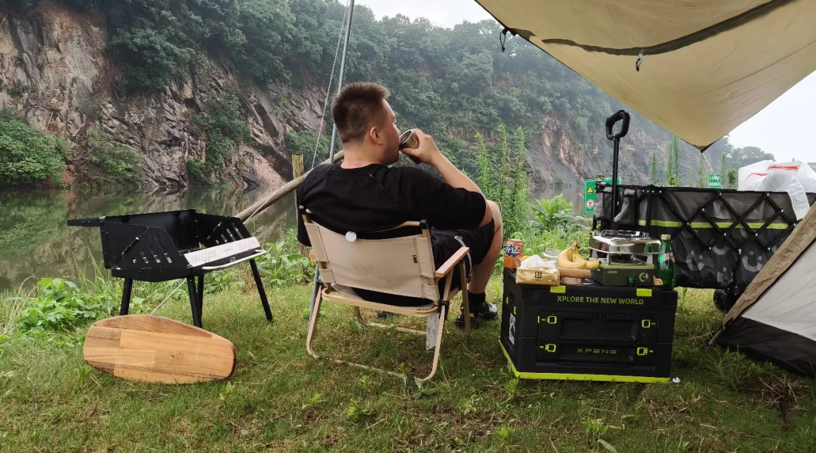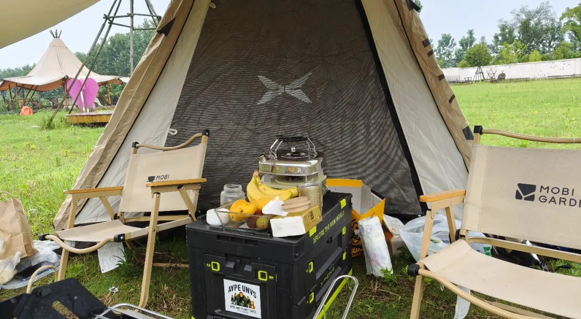 支开帐篷,帐篷是小鹏和其他联名的,速开方式,分分钟打开,而且前面自带小天蓬,我们两个人刚好用,那天微微小雨,有这个篷子坐下下面太惬意了。