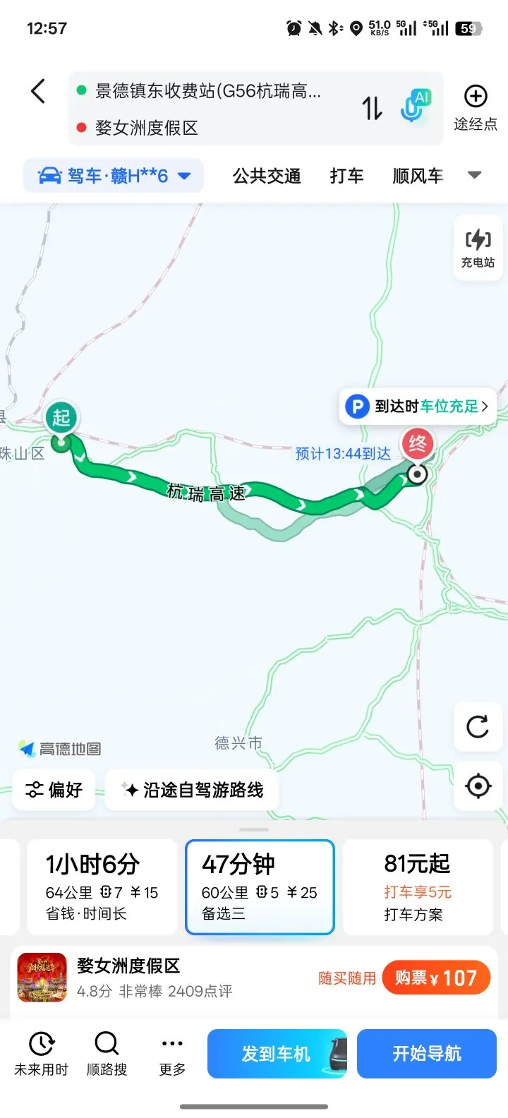 早上从景德镇出发,导航显示到婺女洲度假区60公里,47分钟就能到。