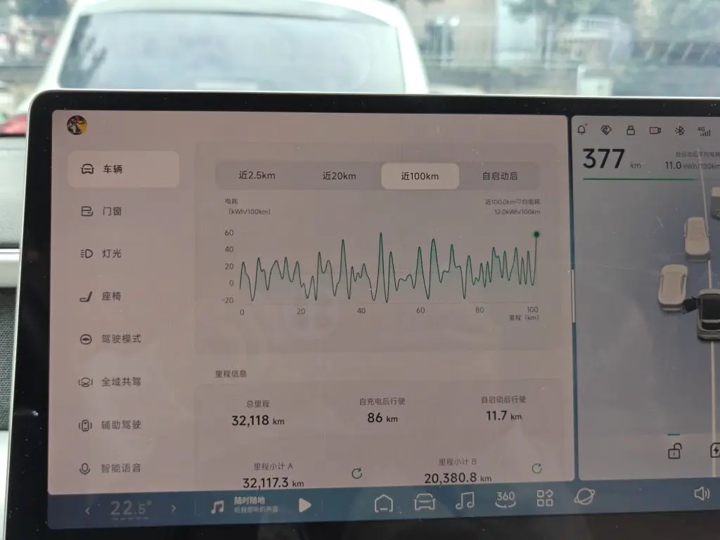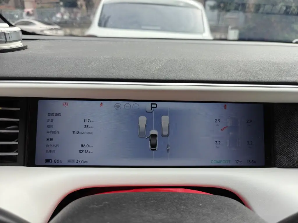 车机显示,自启动后跑了11.7公里,平均能耗11.0kWh/100km。自充电后总共跑了86公里,电量还有80%,表显WLTP续航377公里,完全不用担心续航问题。