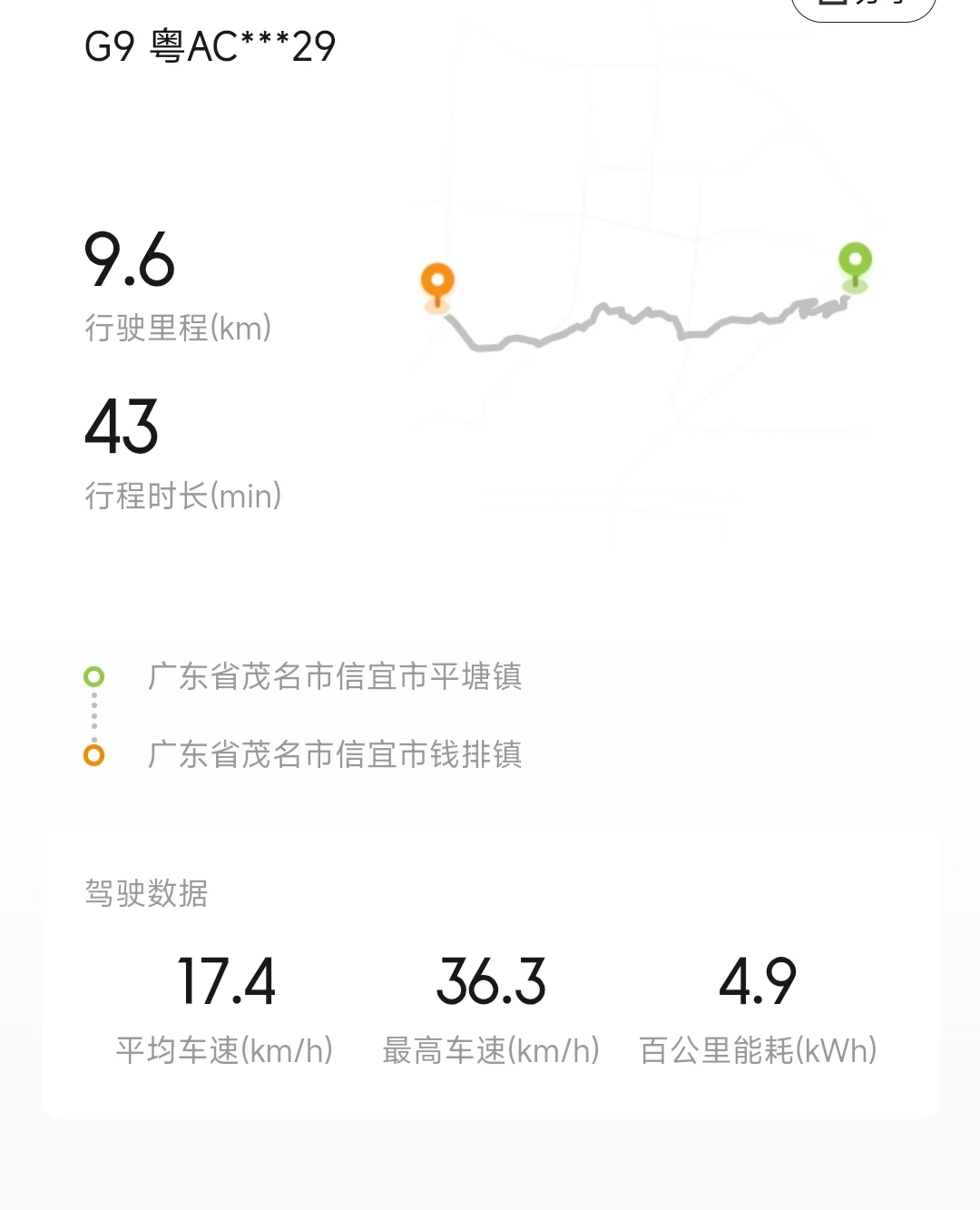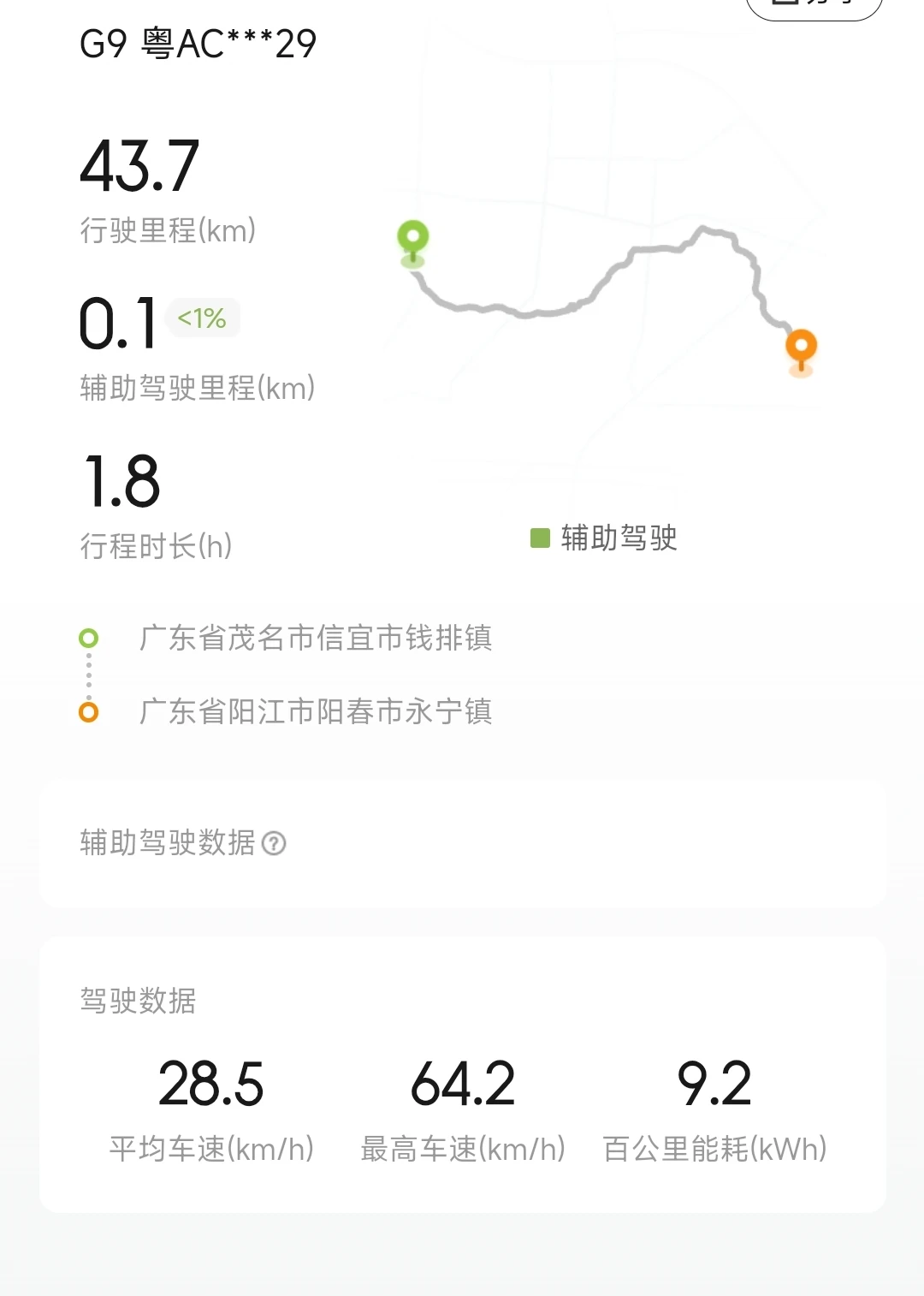 小鹏G9的舒适性、爬山动力、能耗、续航能力都让我们满意!这次我们走过的路途有:有乡村水泥铺装路段、有爬坡上山路段、有下坡下山路段,海拔最高处约1000米,我们驾驶着G9丈量了这片乡土、征服了这座高山,感觉棒极了!G9的能耗表现也让我们很惊讶!从山脚到山顶再下来,约10km路程综合能耗为4.9kwh/100km;县道、乡村道路约45km,还遇上一大段堵车路段,综合能耗为9.2kwh/100km。
