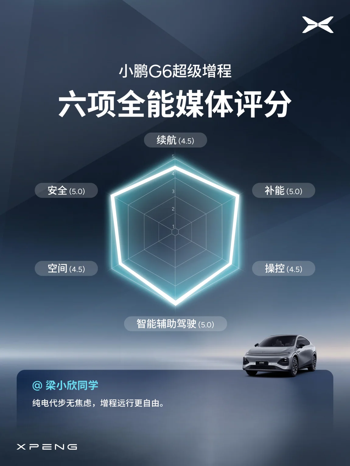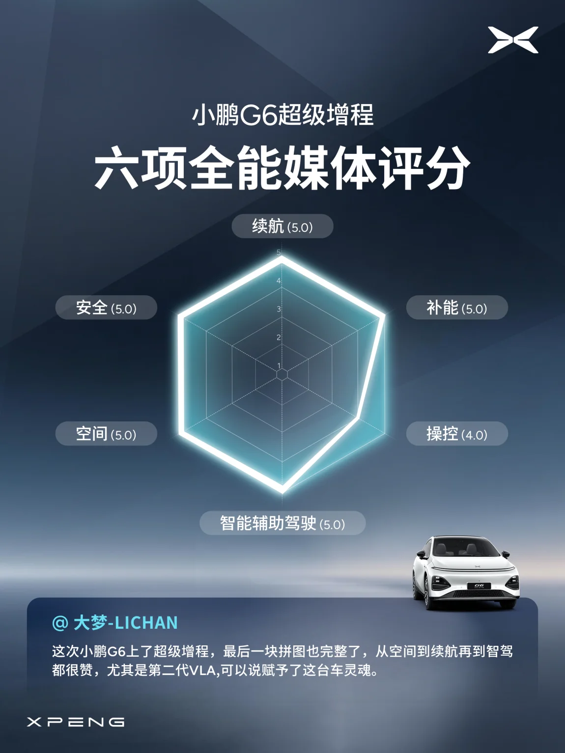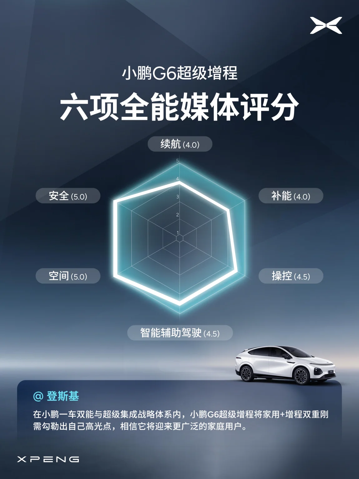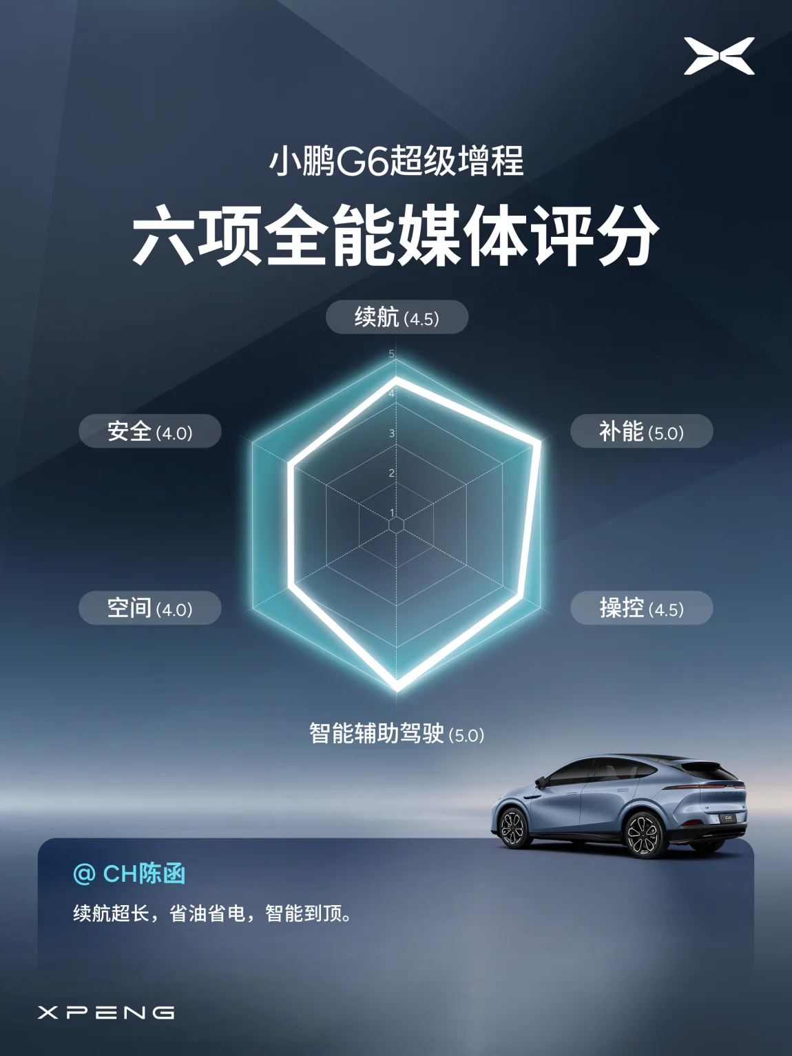 感谢首批试驾小鹏G6超级增程的媒体鹏友给出的评价,也欢迎更多鹏友前来门店试驾,一起解锁小鹏G6超级增程的六边形满分魅力!