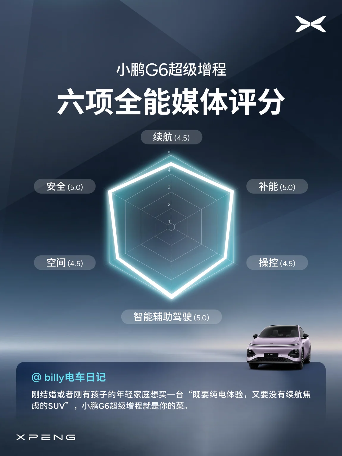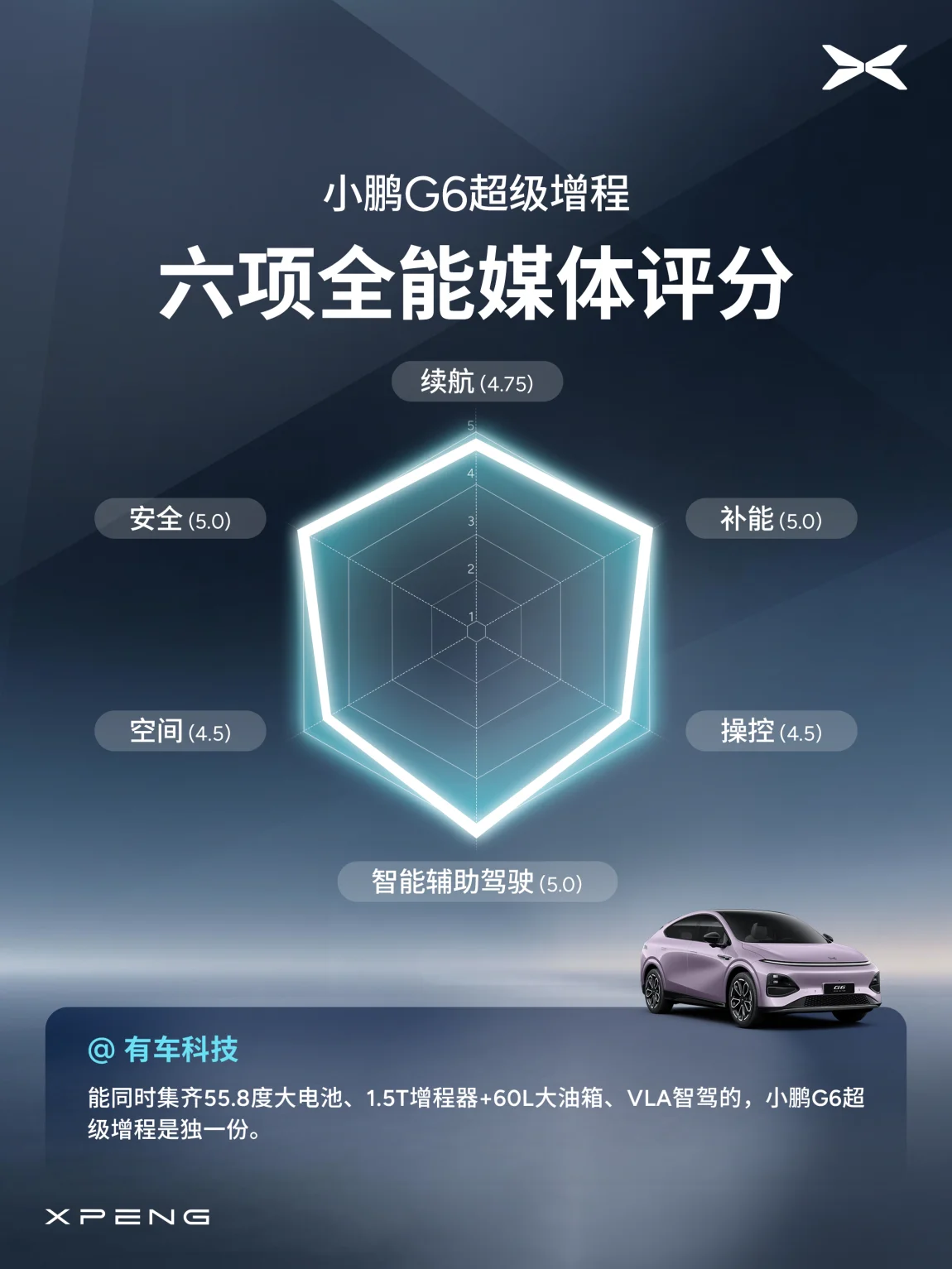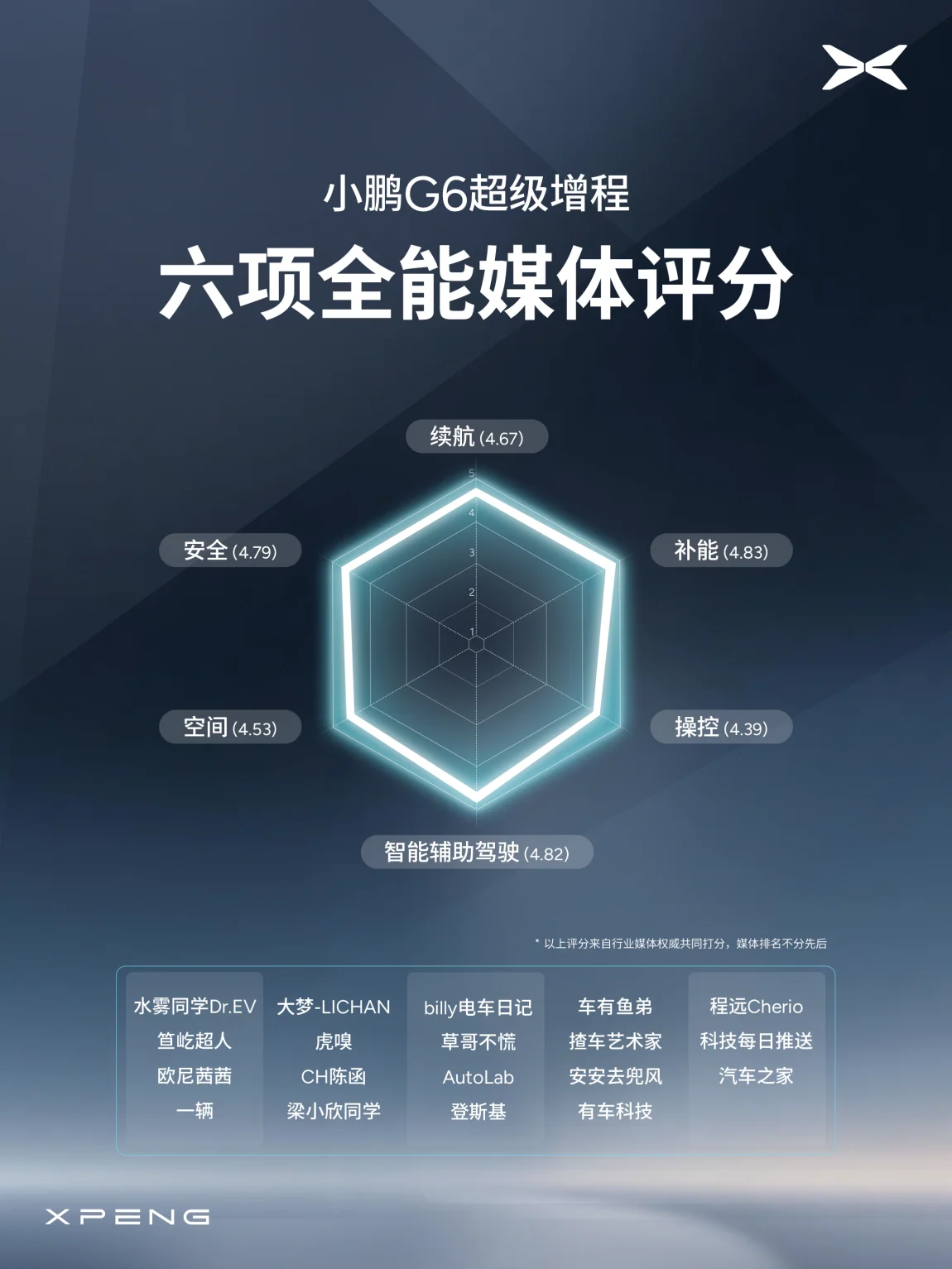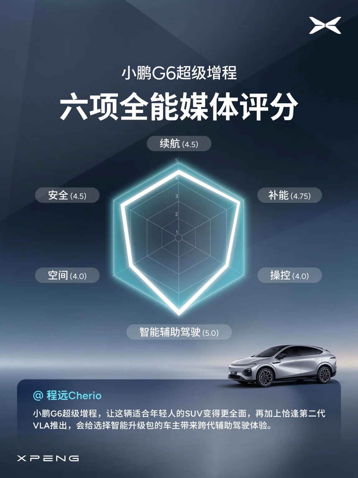 感谢首批试驾小鹏G6超级增程的媒体鹏友给出的评价,也欢迎更多鹏友前来门店试驾,一起解锁小鹏G6超级增程的六边形满分魅力!