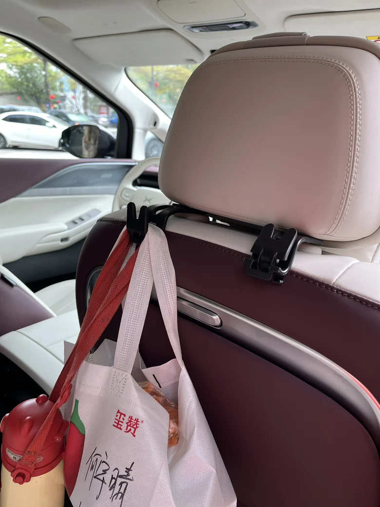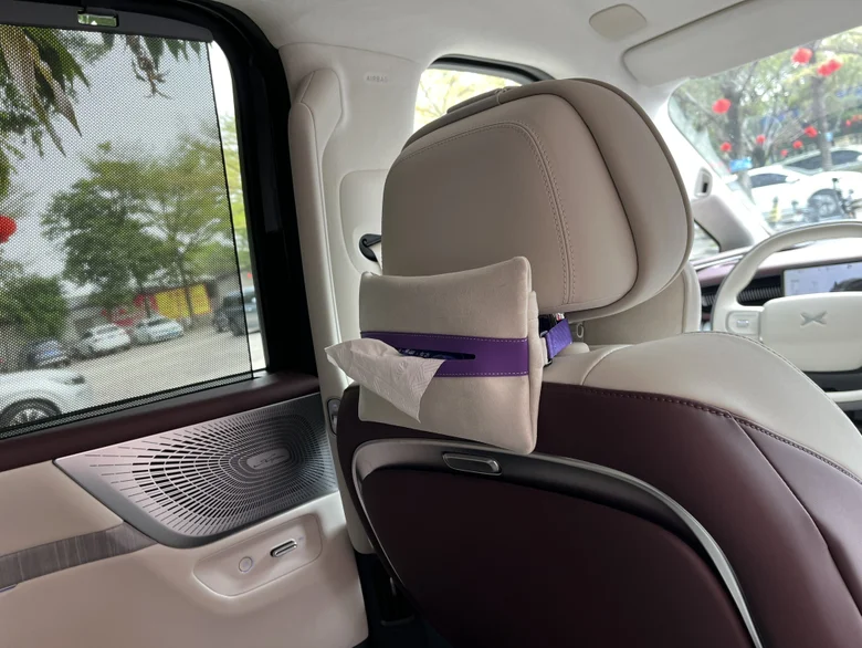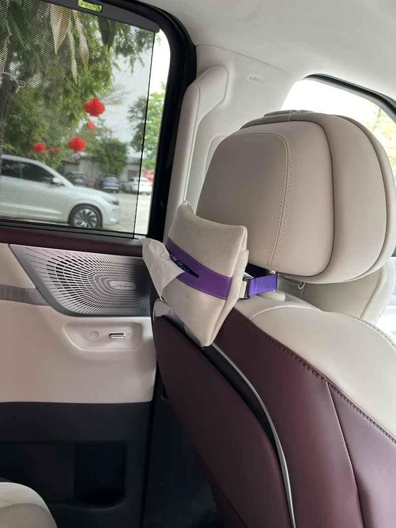 主驾后面挂了一个纸巾盒子,方便后排乘客使用。