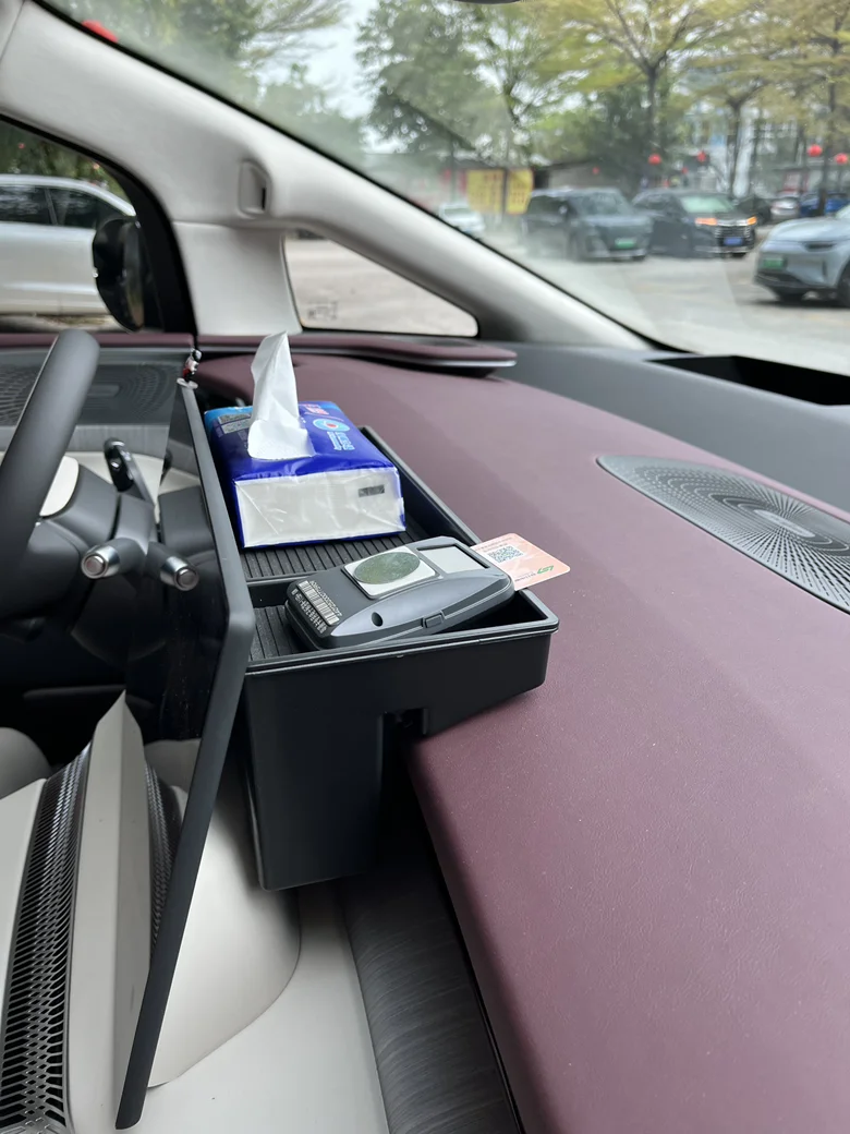 内饰方面。放了个车机主屏后面的置物架,左边放纸巾,右边放ETC,商家说直接放就行,我还是保险一点,怕飞起来,自己贴了3m胶固定。