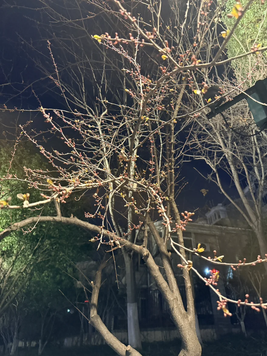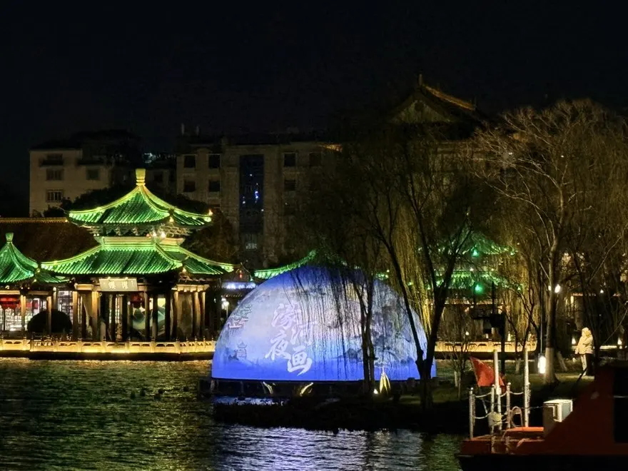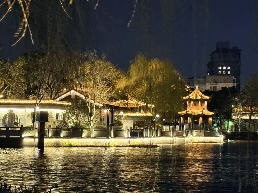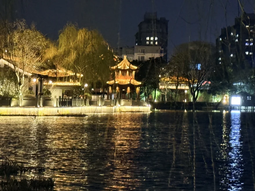 灯光打在亭台上,倒映在水里晃悠悠的,岸边的树都冒新芽了,看着就很有生机。不用特意找景点,家门口的濠河夜游,就很舒服。