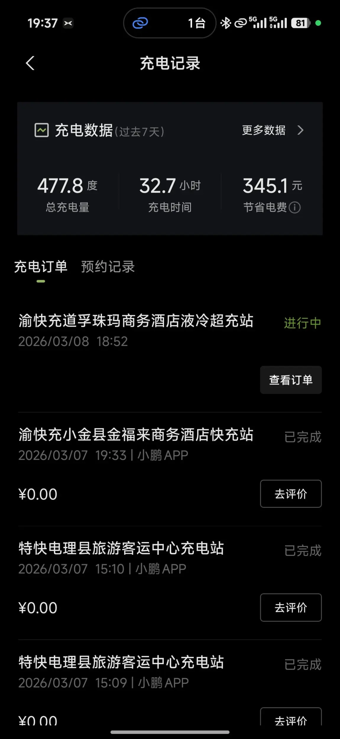 没有门票和昨天一样只有吃饭和住宿费用 充电费用很奇怪电卡试用可以在 渝快充道孚珠玛商务酒店液冷超充站 使用 充完显示要付费 找了客服给免了,说