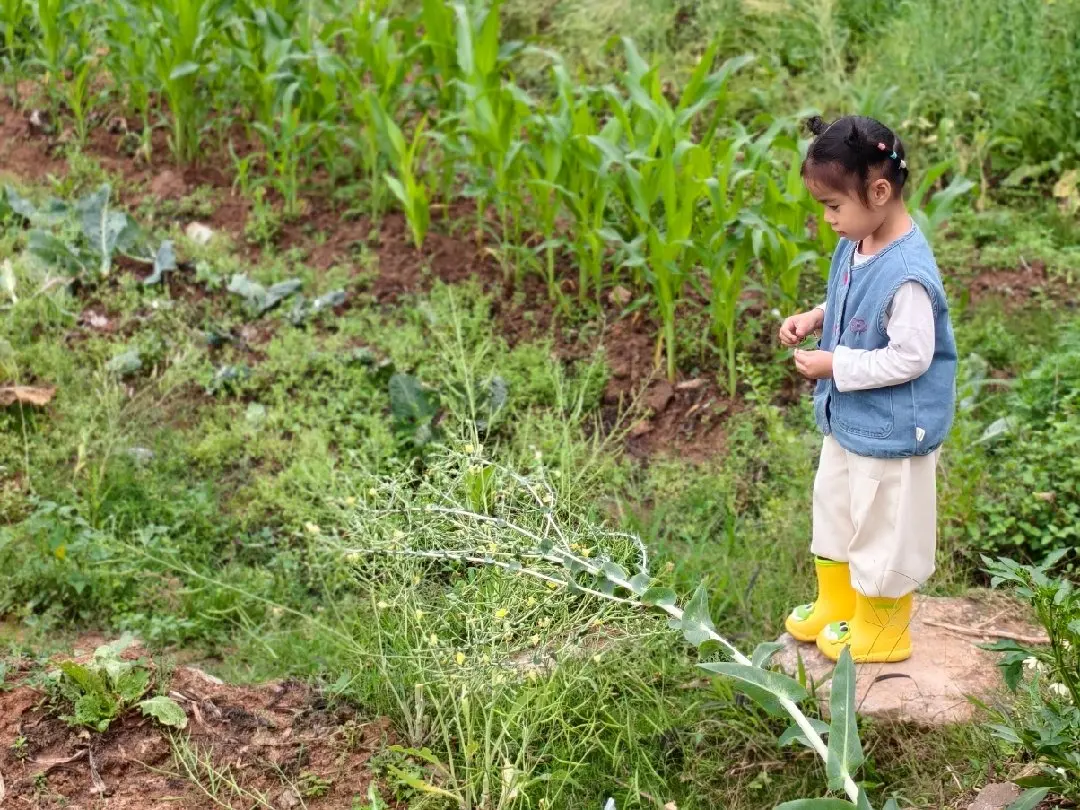 小家伙穿着她最爱的小黄雨靴,蹲在田埂边认真研究着刚开的小花,指尖轻轻碰了碰花瓣,眼里满是好奇。这一刻,没有电子产品的打扰,只有自然的呼吸和孩子的笑声,大概就是春天最治愈的模样吧。