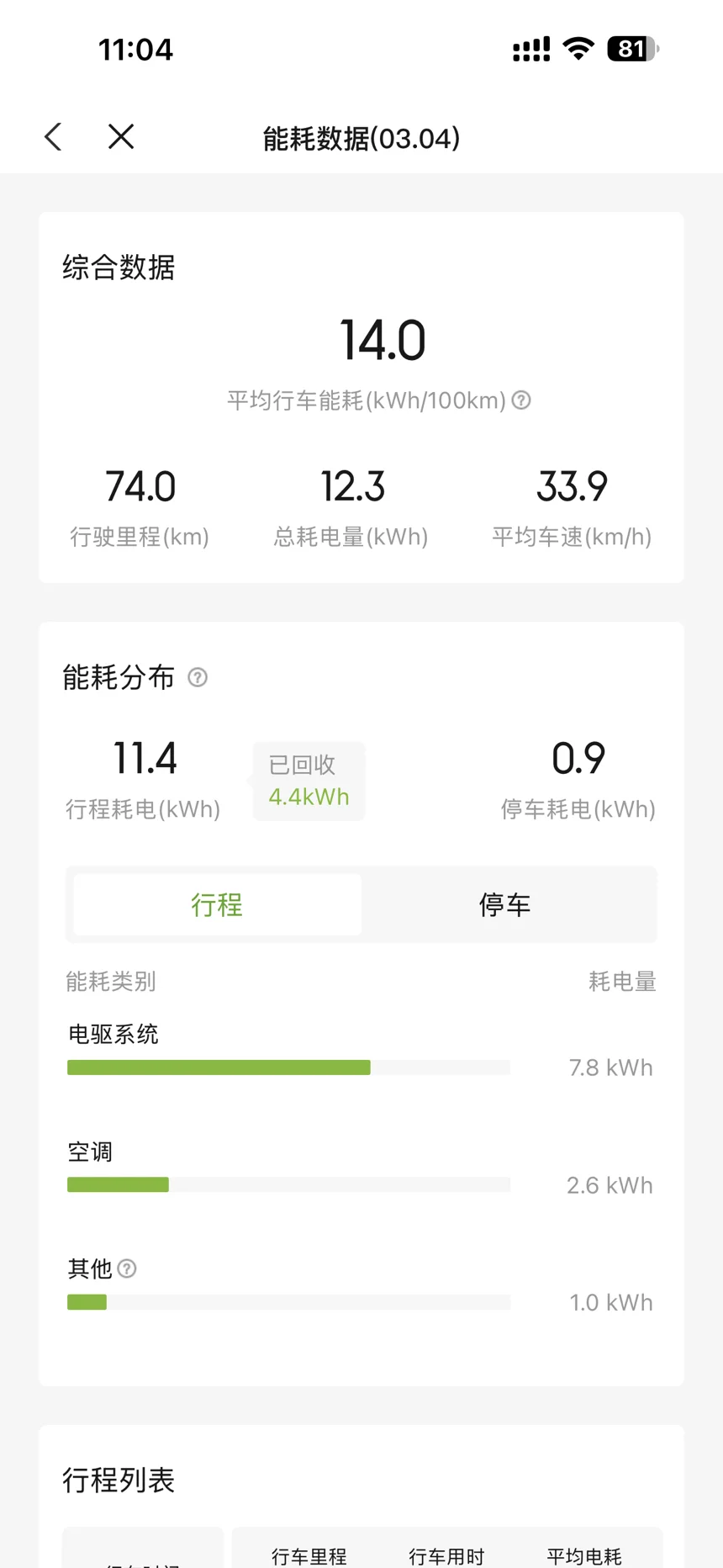 Before(3月4日):平均能耗14.0 kWh/100km,行驶74km耗电12.3kWh,平均车速33.9km/h