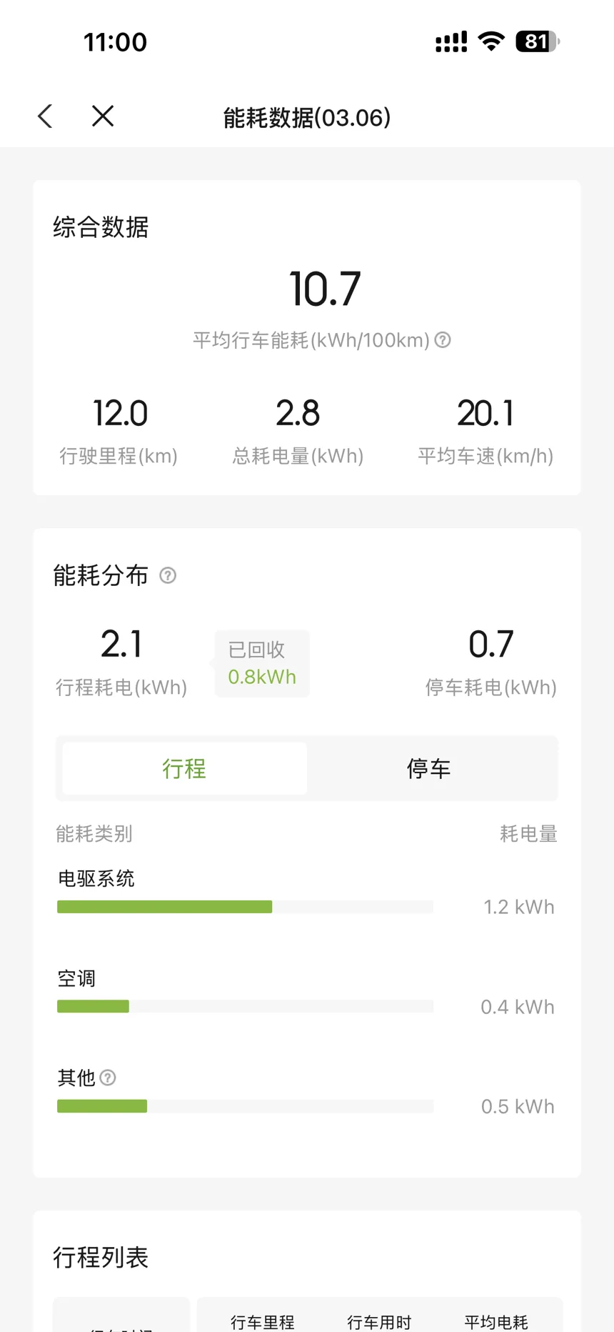 After(3月6日):平均能耗10.7 kWh/100km,行驶12km耗电2.8kWh,平均车速20.1km/h