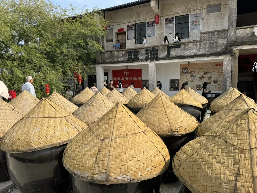 第二站网红咖啡店海农岛酱园。这家由老房改造的小店,玻璃立与碉楼相映,点一杯特调咖啡,坐在稻田边的摇椅上,咖啡香混着稻香与春风,时光慢得恰到好处。