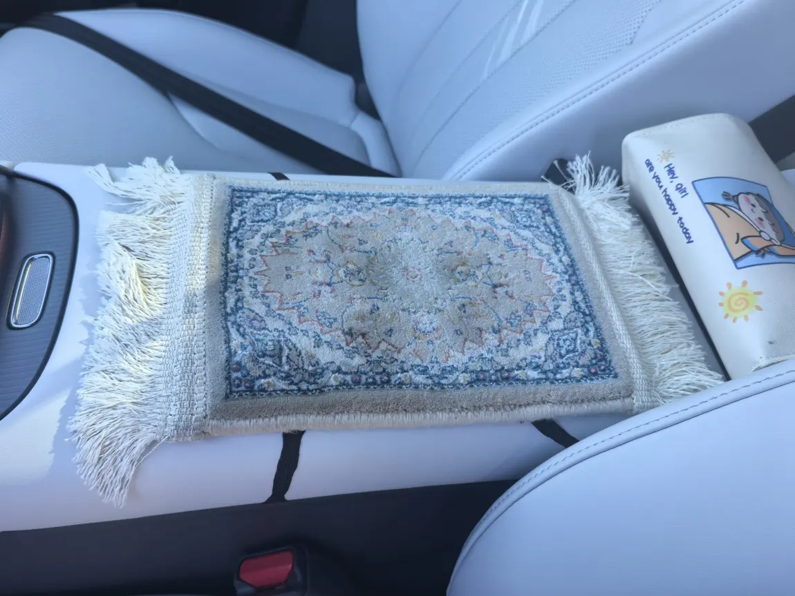 最让我舍不得挪开的,是这块从新疆带回的迷你地毯。它不是刻意的装饰,而是我在喀什老城里,跟着当地匠人一针一线挑出来的宝贝。细密的花纹里藏着西域的阳光,流苏边还带着戈壁的风,铺在中央扶手箱上,每次手撑在这块小毯上,都像触到了那段慢悠悠的旅途。