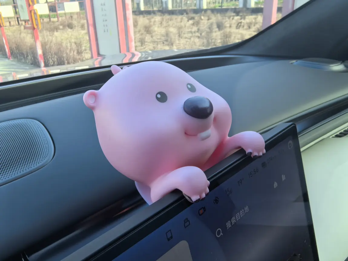 屏幕上趴着的粉色Loopy更是我的「电子搭子」,圆滚滚的身子扒着边框,每次启动车都先被它治愈——谁能拒绝一只会陪你看导航的小海狸呢?软乎乎的硅胶材质,既不挡视线,又给冰冷的科技感添了几分童趣。