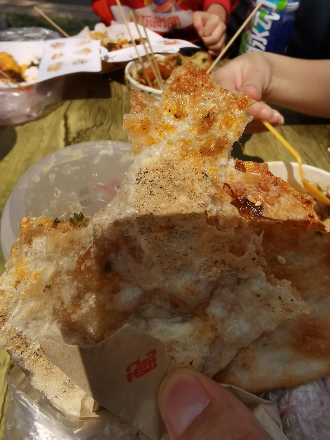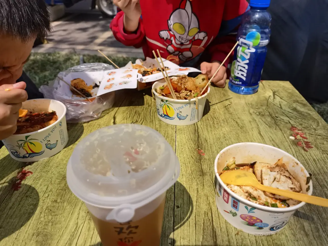 刚煎好的饼还冒着热气,咬一口酥脆掉渣,炒粉镬气十足,连娃都大口炫饭,比在家吃饭香多了。坐在树荫下,吹着风,看着娃们狼吞虎咽的样子,突然觉得这种简单的路边摊,比任何山珍海味都要美味。