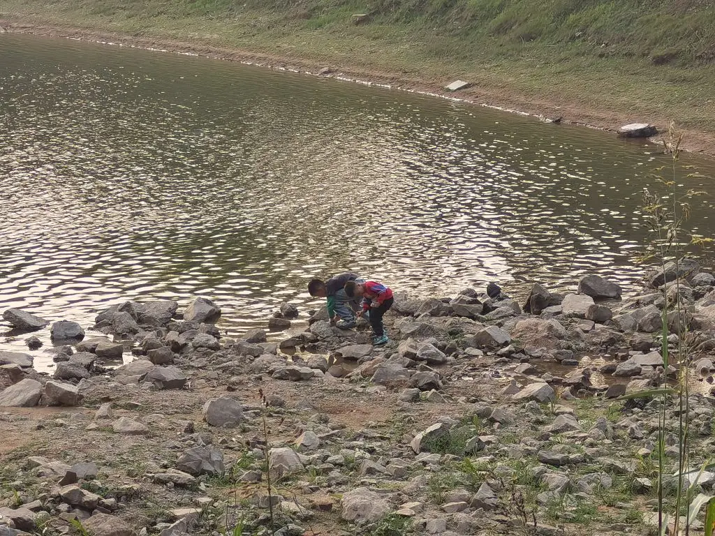 走了大概20分钟,我们发现了一片藏在湖边的河滩,石头堆里藏着小水洼,俩娃一眼就盯上了,吵着要下去摸鱼、捡螺丝。