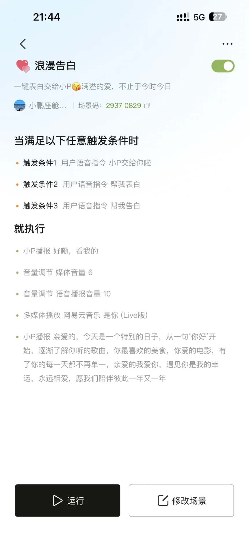这是本次告白的核心灵魂!我专门在小鹏APP里通过智慧场景编写了一套告白程序。