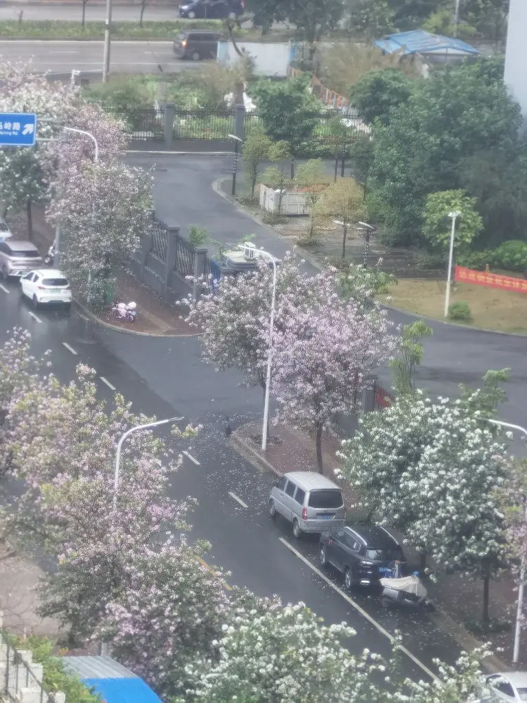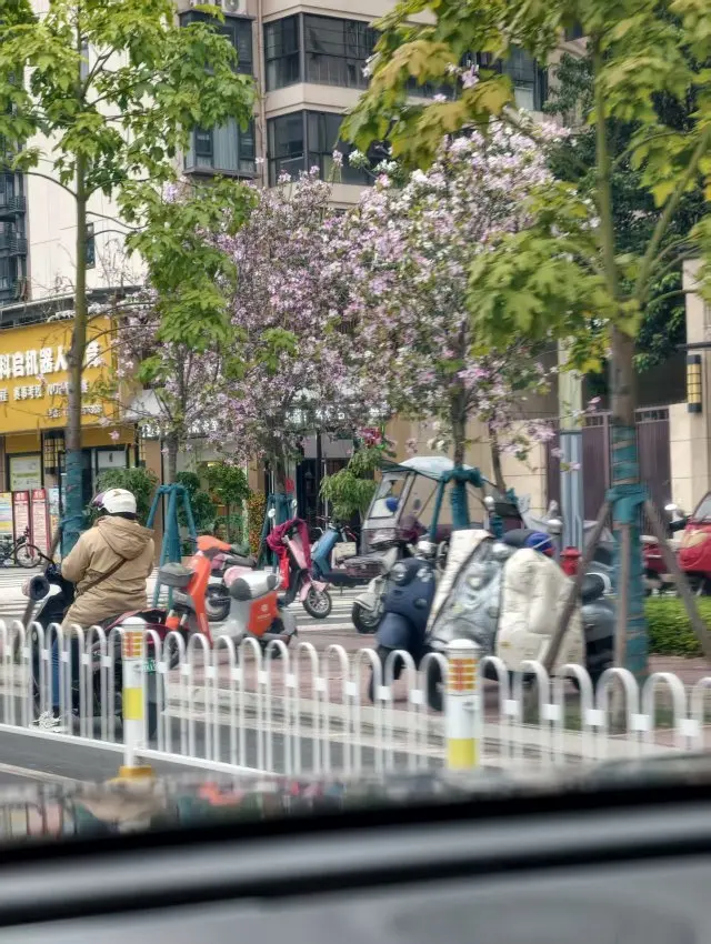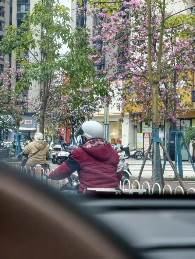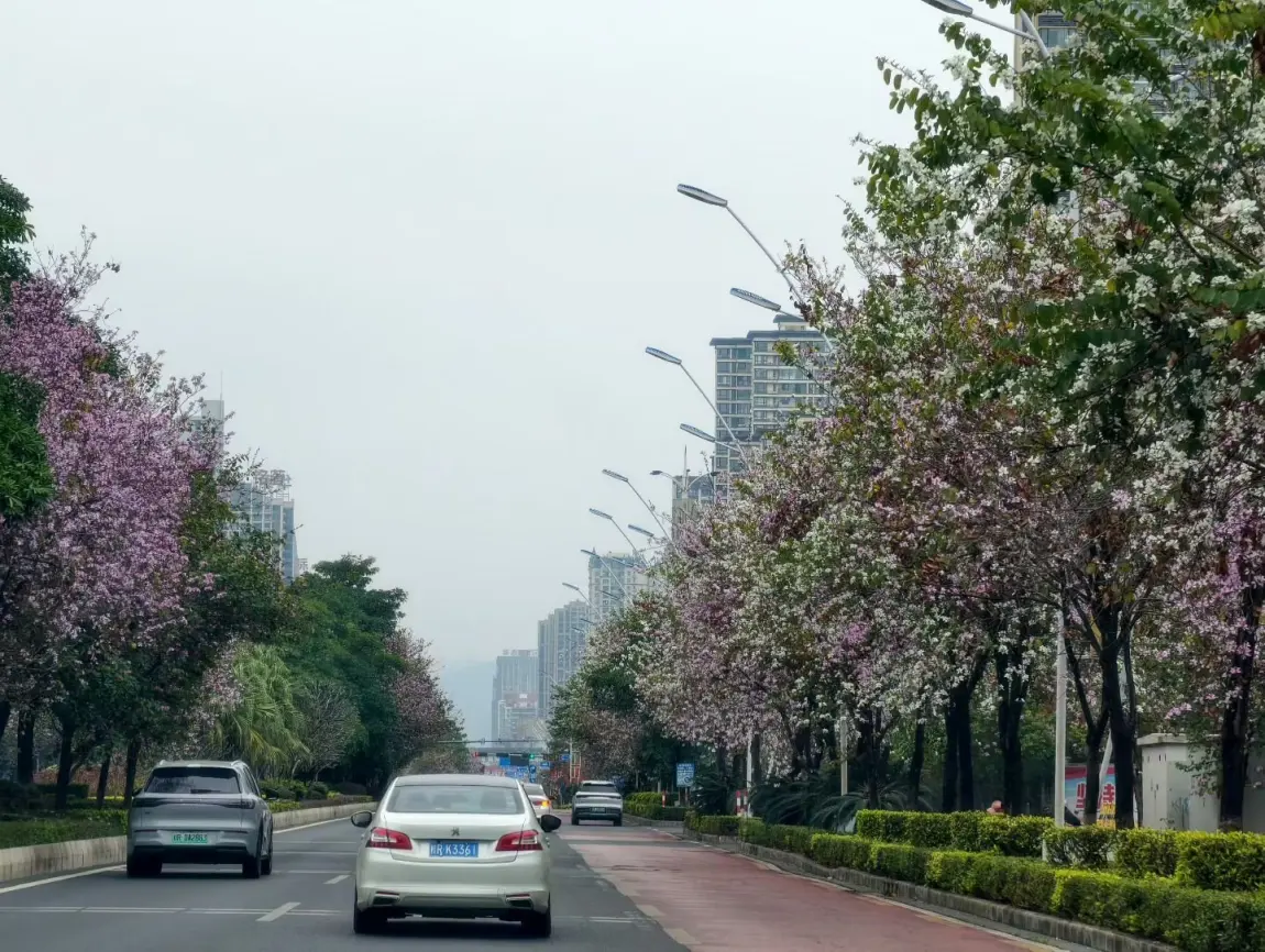 车流规整,路旁粉花成线,