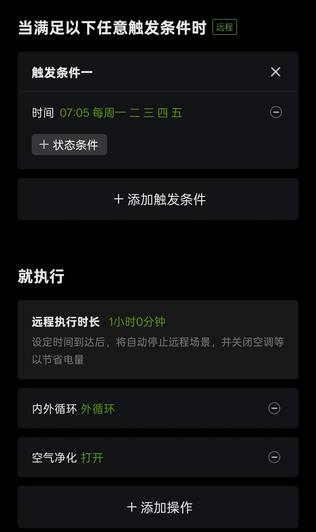 第一点,我定制了一个智慧场景,要求小P在我上班当牛马前,打开空气净化功能,把车的空气先进行一次的循环更新,把腐霉的气息全数排出车外。