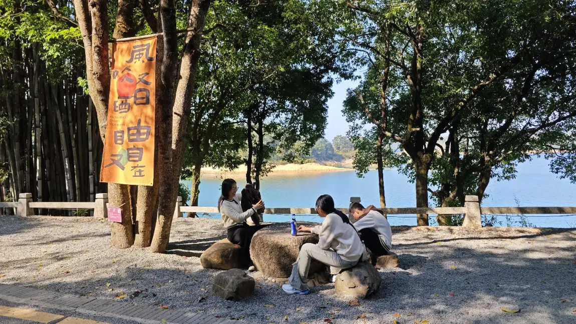 看着家人们沐浴着三月春天的暖阳,围坐在路边的石凳石桌,在这绿荫树下,宝蓝色的湖面作为背景。