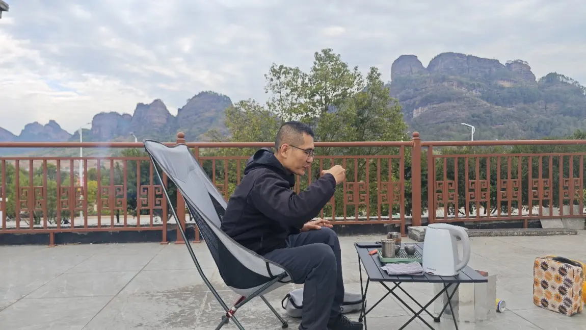 与友人面向名山品茗茶聊人生。