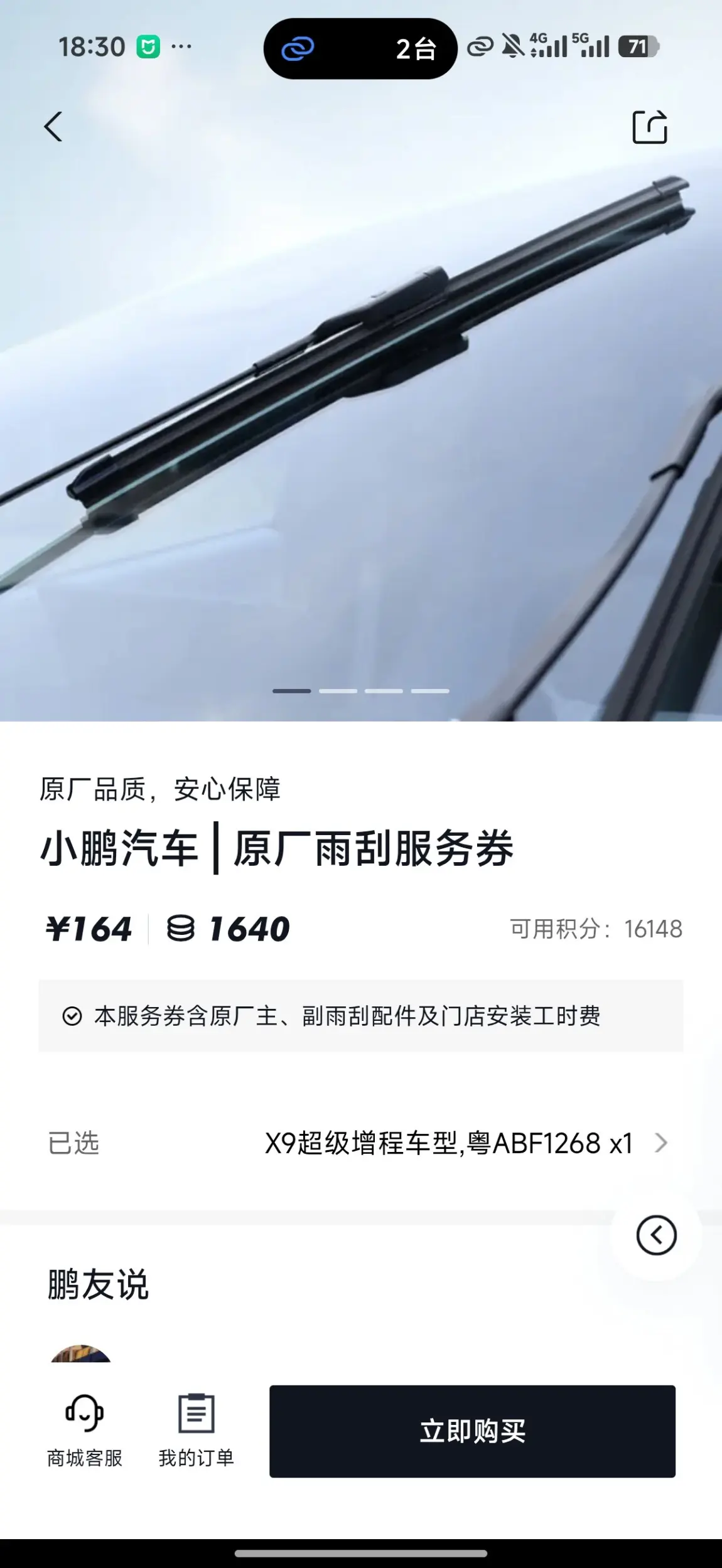 经过一个冬天的风霜,雨刮胶条容易老化变硬。小鹏商城为我们贴心提供了雨刮更换的服务。