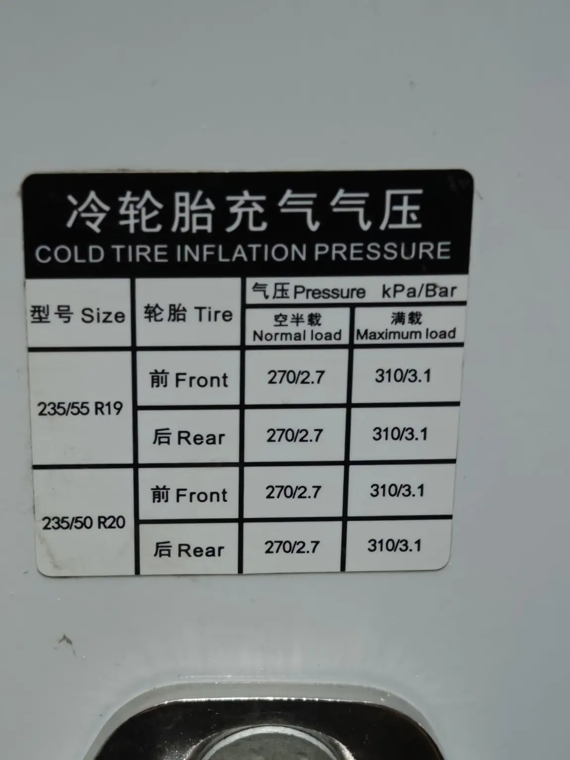X9作为家庭用车,轮胎安全至关重要。我会定期检查轮胎的胎压和磨损情况,春天胎压容易随气温变化,保持标准胎压(在主驾这一侧的B柱有标明→半空载2.7bar,满载3.1bar)