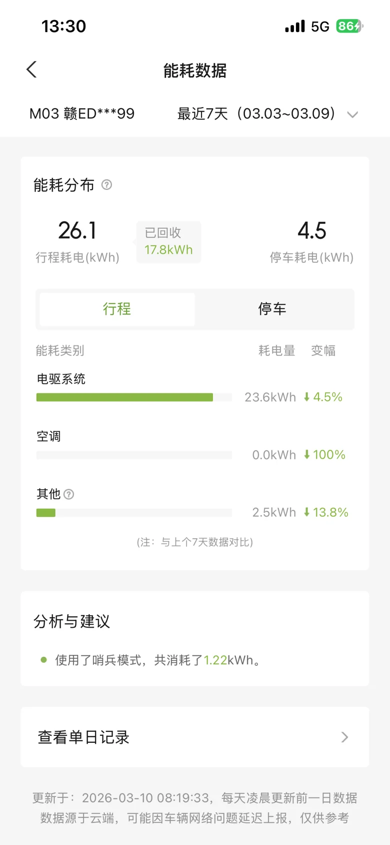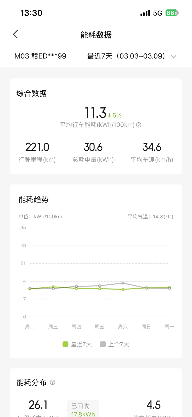 最近7天(03.03~03.09)开着我的小鹏MONA跑了221km,平均行车能耗只有11.3kWh/100km,比上周期还降了5%,春日省电效果还挺明显。😲