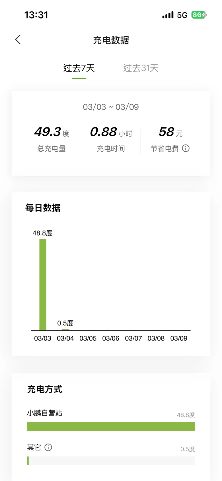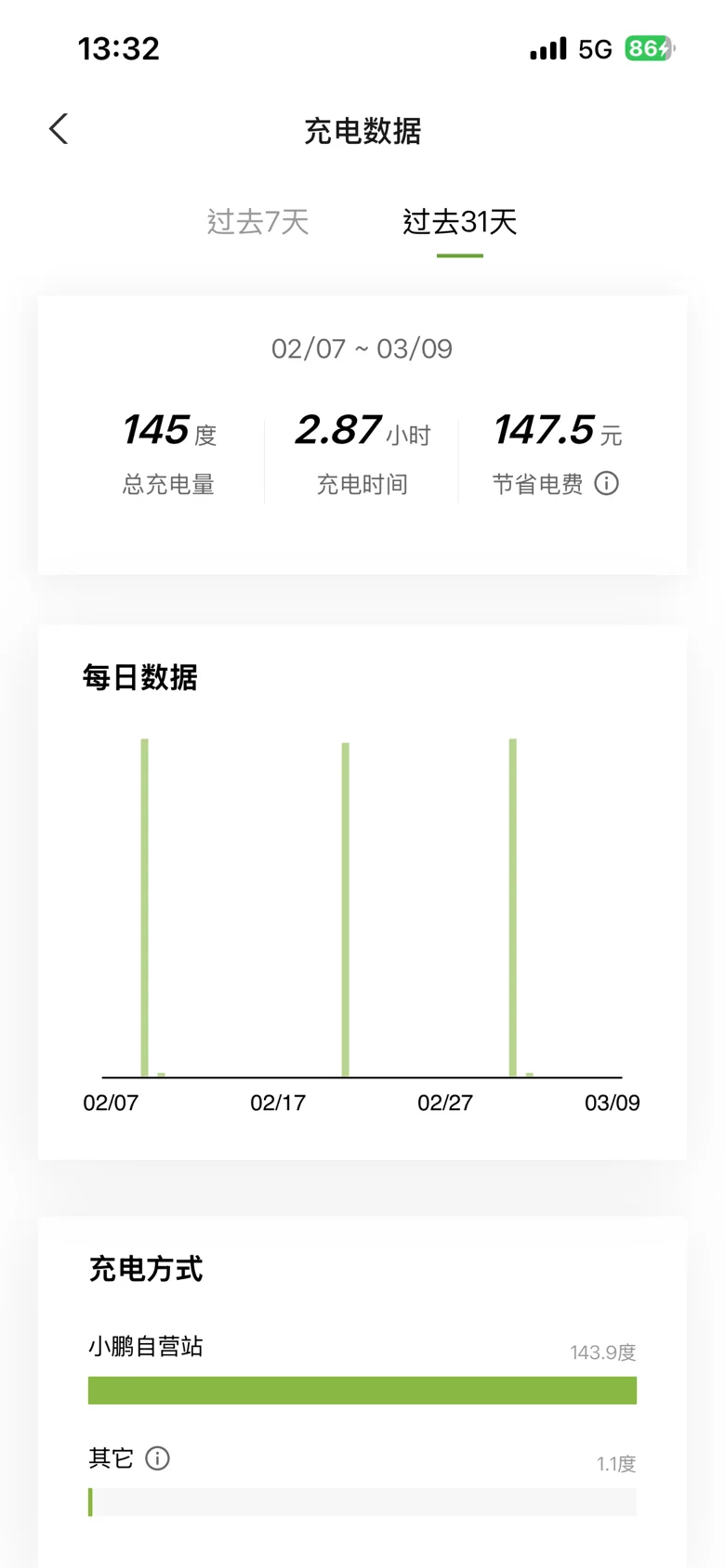 这阵子充电也很省心,过去7天只充了49.3度电,大部分都是在小鹏自营站补能,既方便又划算。看着能耗趋势一点点往下走,既省钱又环保,这种踏实的感觉真不错。😜低碳出行,从每一次平稳起步开始~因为能耗低,出行不用担心充电费用的问题,随时随地出门踏青😌@社区活动小姐姐 @鹏友大管家