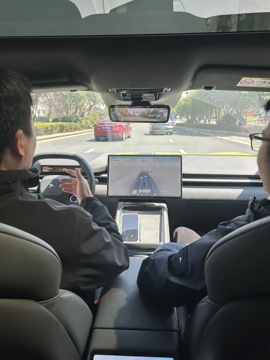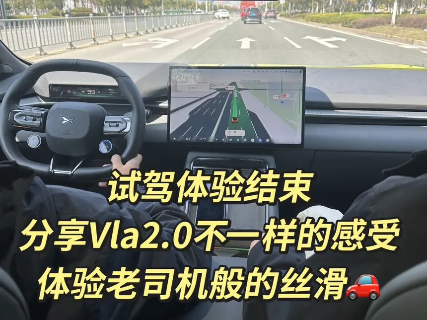 2️⃣ 开启“老司机”模式 坐进车内开始试驾,第一感受就是“丝滑”。在VLA 2.0的加持下,车辆的起步、变道、博弈动作非常像人。正如我在图里感叹的,双手虽然放在盘上,但那种从容感,真的是把“安全感”拉到了最高。车辆不再是僵硬地执行代码,而是在感知和理解环境。🚗💨