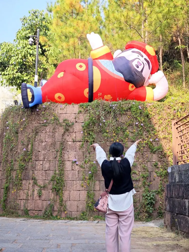 虽然是新建的街区,但里面还是藏着不少有意思的地方和古迹底蕴的。比如这个超大的莲花台,必须得上去打个卡!媳妇非要上去模仿一把观音菩萨,这pose摆得,是不是还有点那味儿了?😂(对了,还会不定时刷新小姐姐在上面跳舞哦)