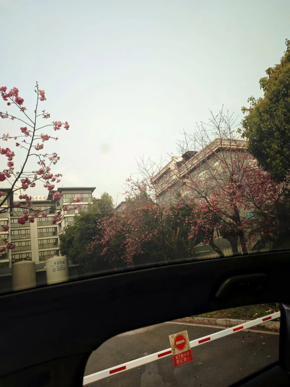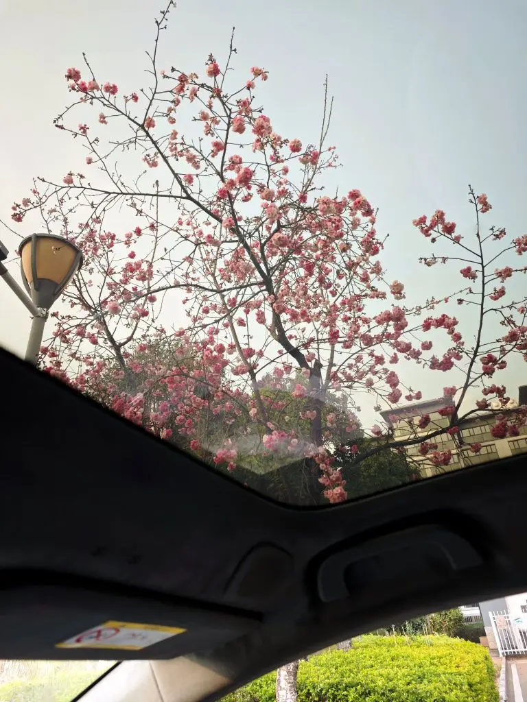 坐进车里,抬头就是一片粉色花海(这么多花了,这就是海🥹)。顺手透过全景天窗拍了一张,虽然隔着玻璃透光率不是完美的100%,但依然能看出来这樱花的颜色相当鲜艳,坐在车内满眼都是春天的气息。