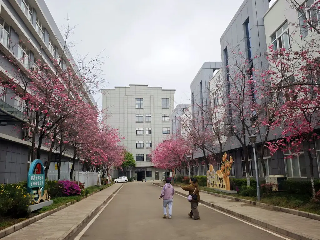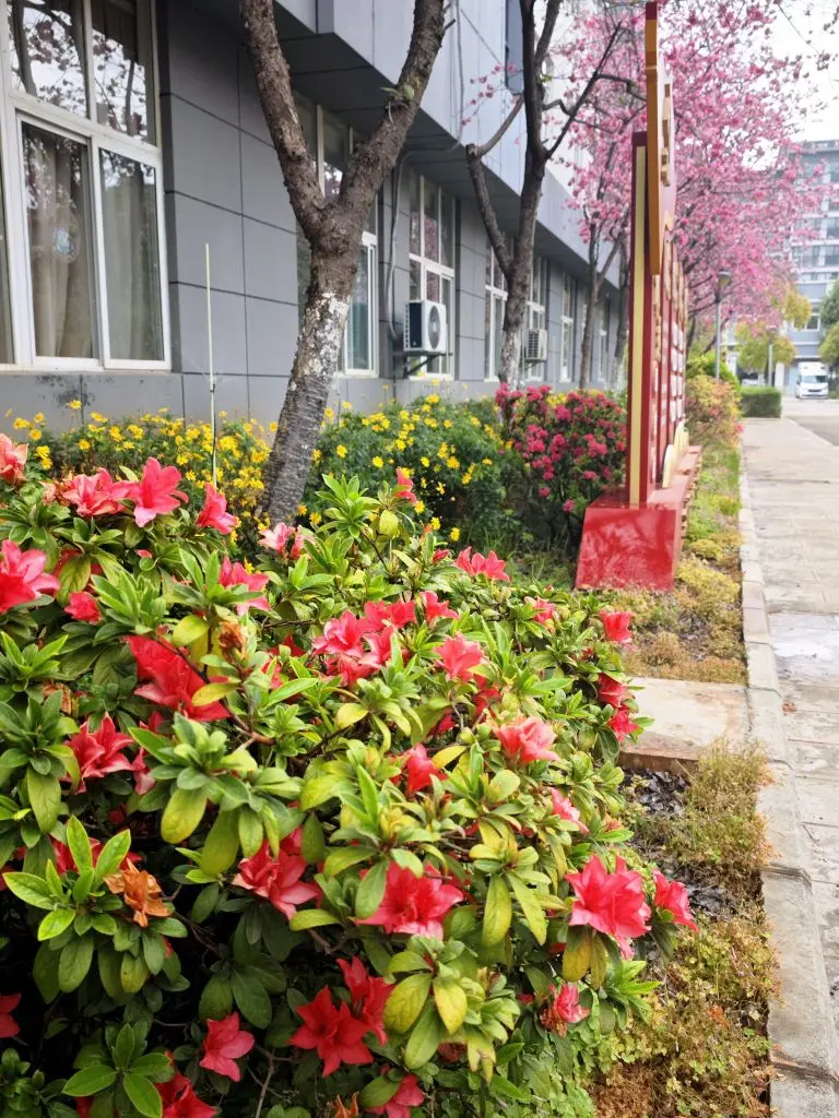 绿化带里其他的红花绿叶也都不甘示弱,跟远处的樱花交相辉映,整个院区现在生机盎然。
