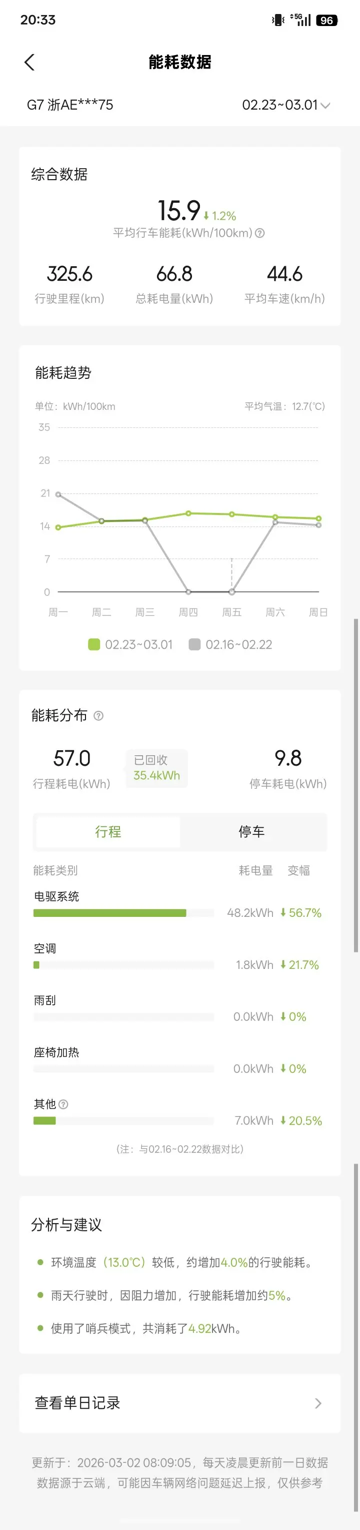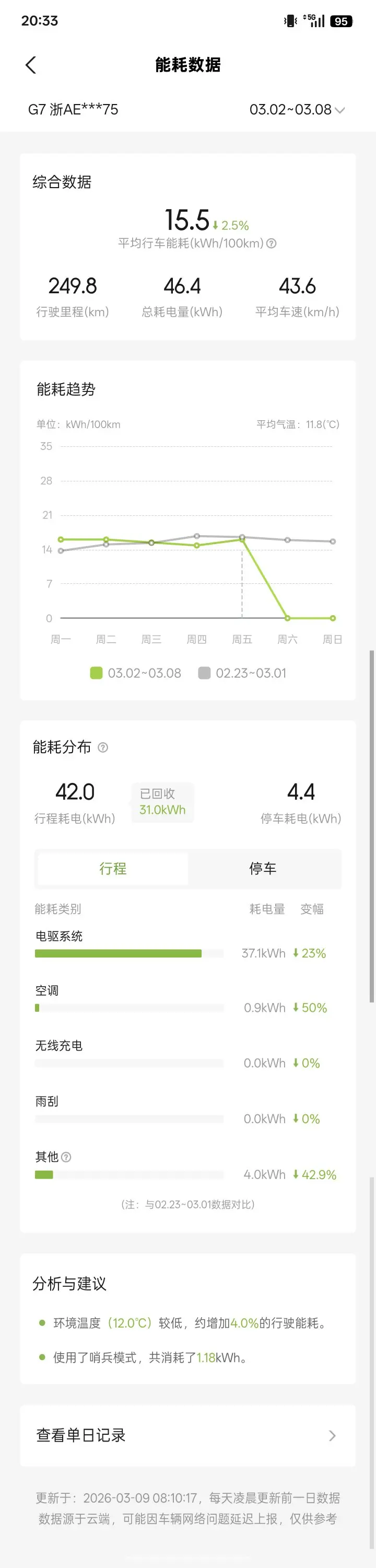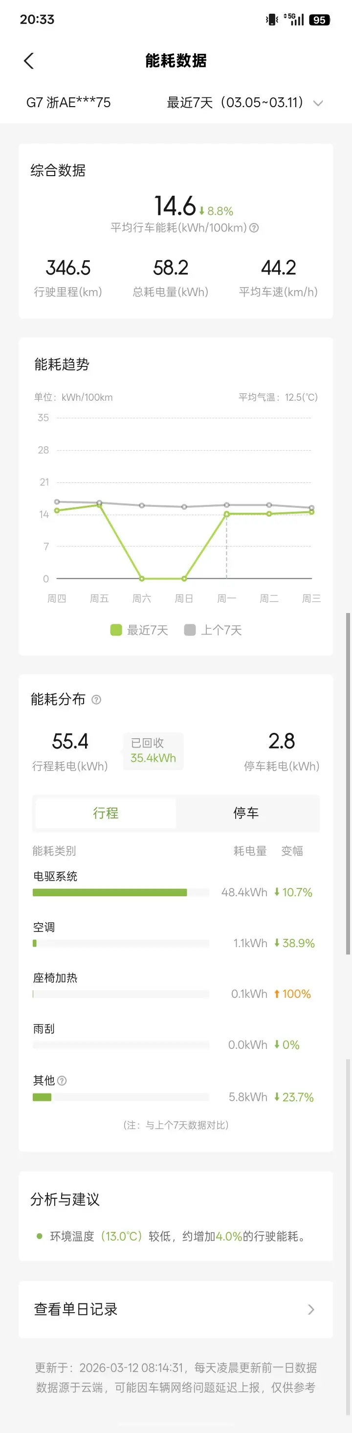 2月下旬我的平均行车能耗还是15.9kWh/100km,3月第一周就降到了15.5kWh/100km,最近7天更是直接做到了14.6kWh/100km,单日能耗最低仅14.1kWh/100km。要知道,春日早晚仍有凉意,我日常通勤全程暖空调、座椅加热、方向盘加热全开,路上听歌、看视频也从不克制,能交出这样的能耗答卷,真的远超我的预期。