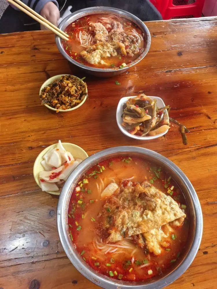 赏完美景,必须安排地道的栖凤渡鱼粉。这次没去网红“独一家”,转而打卡满哥鱼粉。进店一问老板,得知和郴州市区是同一家,味道完全同步,瞬间更期待了。粉上桌,汤色红亮诱人,鱼汤鲜醇浓厚,茶油的香、鲜鱼的甜、辣椒的辣完美融合,米粉爽滑劲道,吸饱汤汁后一口嗦进嘴里,鲜、香、辣、滑在舌尖炸开,热乎下肚通体舒畅,这口非遗美味,果然名不虚传,一碗下去,春日的惬意与烟火气都齐了。