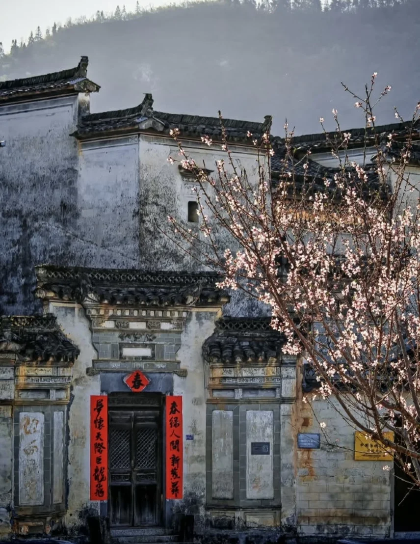 徽州碧山古村落,早樱探出白墙黛瓦,给水墨画增添了色彩。