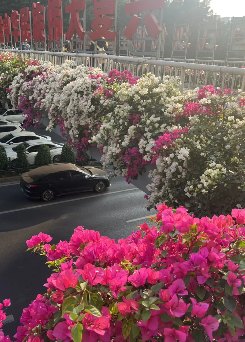 白天的广州街角,三角梅从过街天桥倾泻而下,热烈得像这座城市的温度。晚上再去感受花市的热闹😃