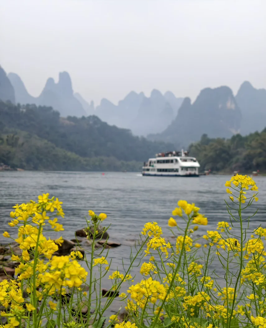 桂林山水间,油菜花把漓江两岸染成金黄。