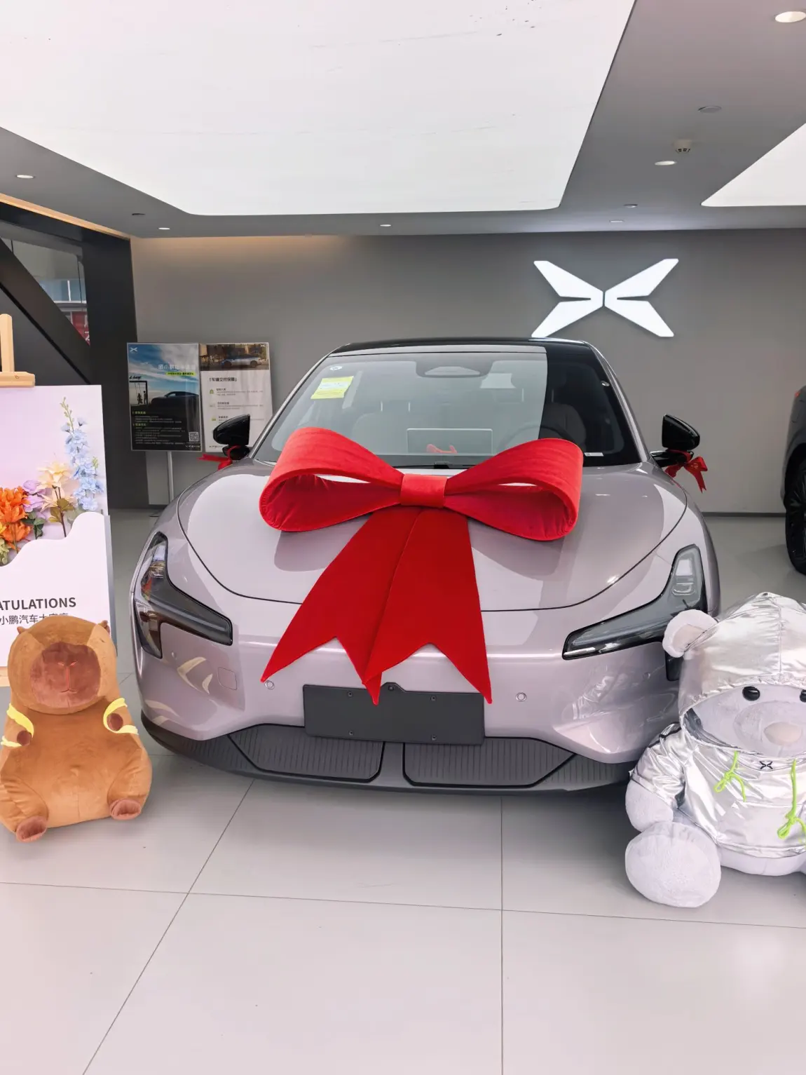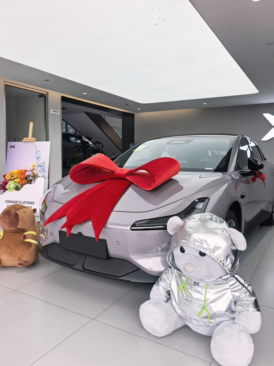 到店后车子已经洗得干干净净,满电状态停在交付区,红丝带和专属交车牌都安排上了,仪式感拉满💯