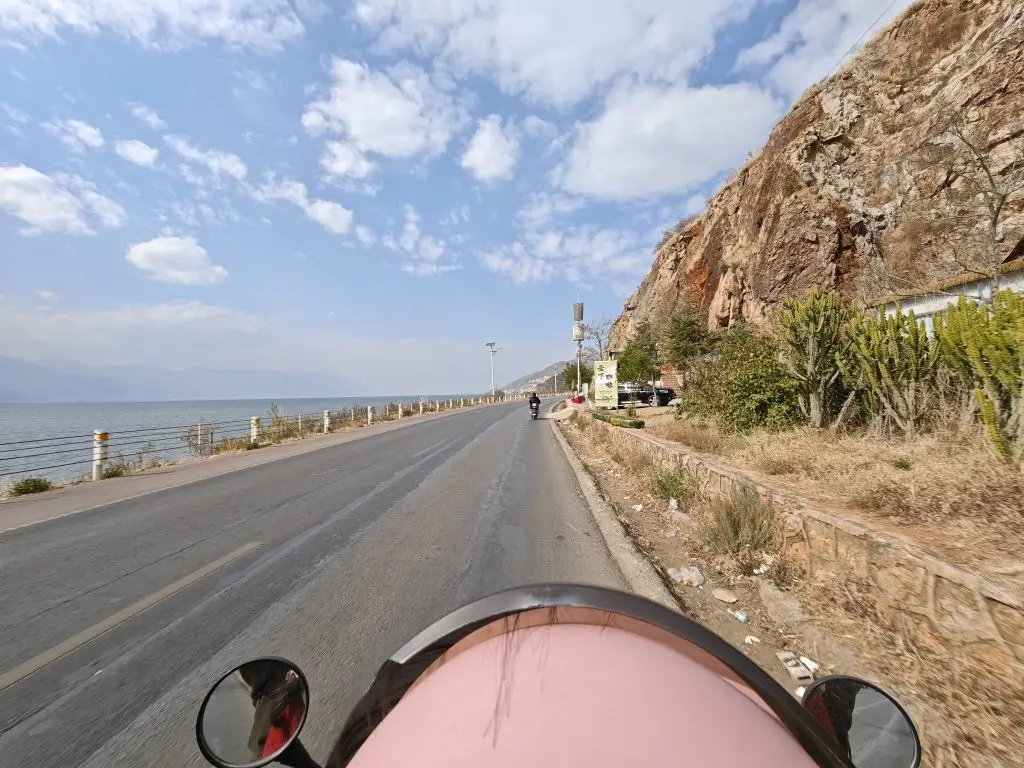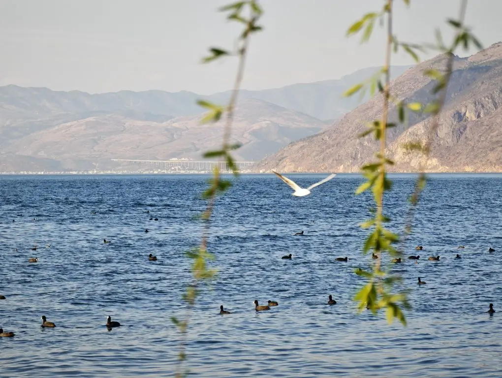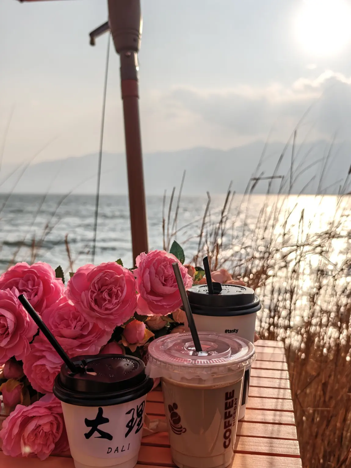 在大理的日子,连风都变得温柔慵懒。洱海边的午后,阳光碎成粼粼波光,铺在水面上晃得人睁不开眼。我坐在临湖的木桌前,捧着印着“大理”二字的咖啡杯,看粉色玫瑰在风里轻晃,听芦苇荡沙沙作响。