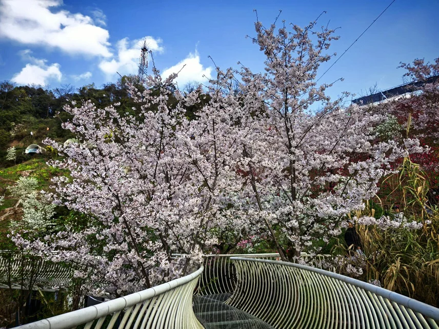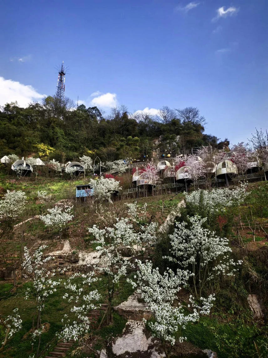 营地后的桃花林开得轰轰烈烈,玻璃观景台上随手一拍都是大片。