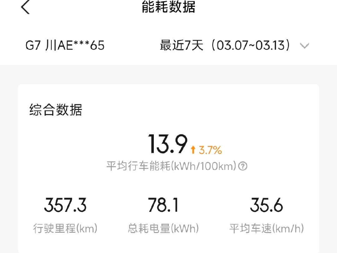 最近7天(03.07~03.13)我的G7平均行车能耗13.9 kWh/100km,行驶357.3km,总耗电78.1kWh,平均车速35.6km/h,平均气温15.6℃,比上一个7天的能耗略高了3.7%。