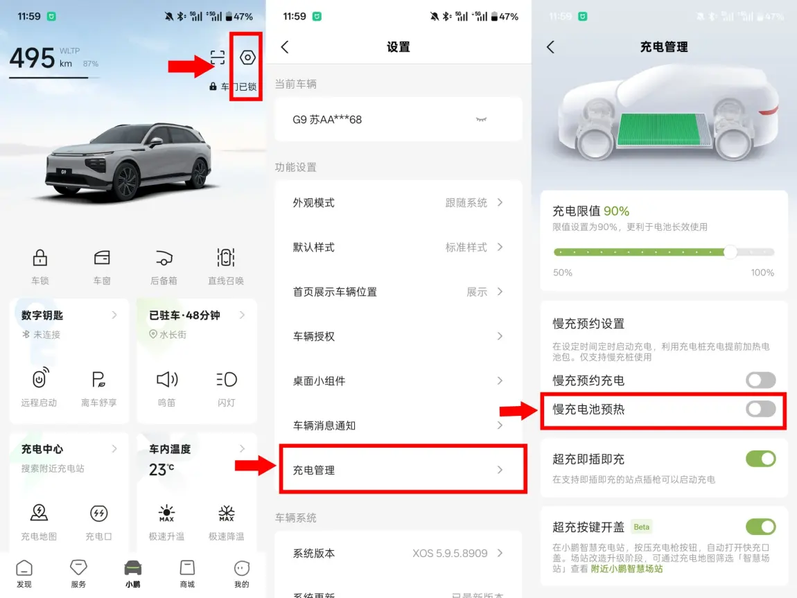 具体设置方法如下图,打开app,点击小鹏,点击右上角设置,选择充电管理,打开慢充电池预热即可。