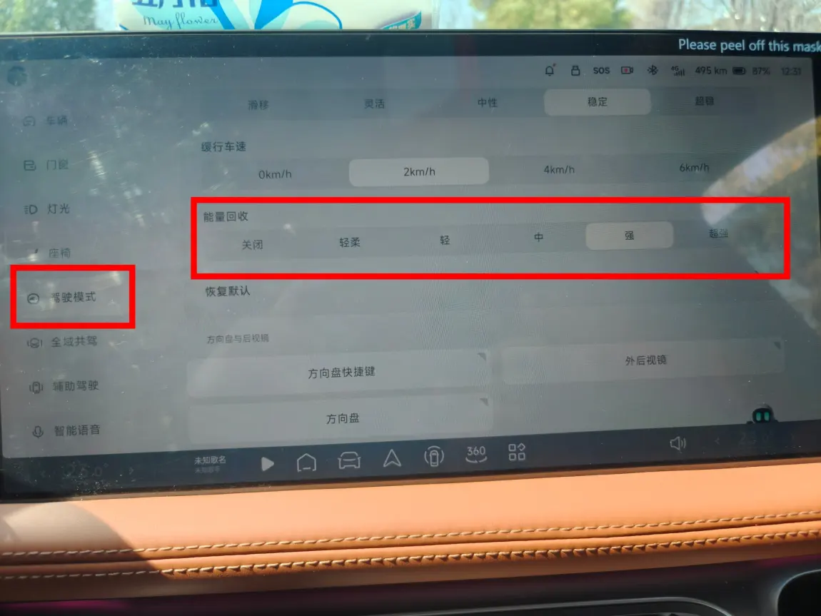 设置方法也很简单,车机端打开车辆设置,选择驾驶模式,下滑后有一栏能量回收,可以根据个人开车习惯设置合理的能量回收模式。